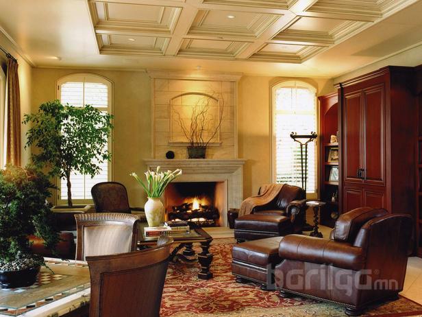Тансаг чанарын торгон хөшиг, гараар сийлбэрлэсэн камин зуух, бүх талаараа хүний сонирхлыг татах зочны өрөөг танилцуулж байна.