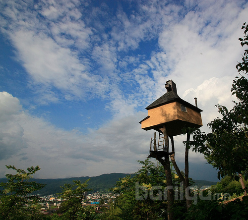 Такасуги гэдэг нь үгчилбэл маш өндөр дээрх цайны байшин гэсэн утгатай үг бөгөөд Японы Нагано хотод ойролцоох уулнаас нь огтолж авчирсан хоёр туулайн бөөр модны дээр байрладаг аж. Уран барилгачин Тэрунобу Фужиморигийн барьсан, нэг өрөө бүхий энэ байшингийн дотор талыг гөлтгөнөөр бүрж, хулсан шал дэвссэн байна.