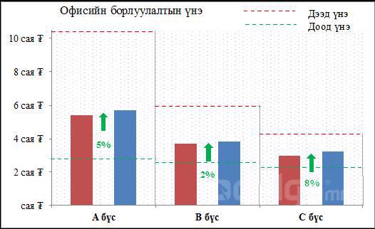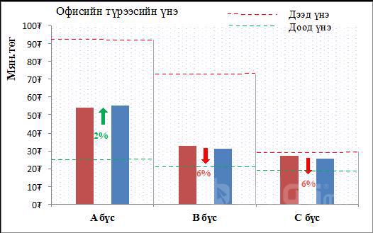 Дээрхи графикаас харахад оффисын түрээсийн үнэ А бүсэд дунджаар 2% өсөлттэй байгаа нь үнийн хандлага энэ бүсэд харьцангуй тогтворжсон байгааг, B болон C бүсэд дунджаар 6%-ийн бууралттай байгаа нь үнийн хандлага эдгээр бүсүүдэд саарсан байгааг тус тус харуулсан байна.