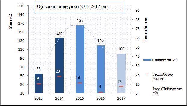 Мөн оны сүүлийн хагас гэхэд зах зээл дээр 9 төслийн 82031м2 офисийн талбай ашиглалтанд орохоор хүлээгдэж байгаа бөгөөд төслийн явц дунджаар 85% байна. Энд дурдагдсан “оффисын цэвэр талбай” гэдэгт барилгын нийтийн эзэмшлийн талбай болон өөр зориулалтаар ашиглагдах талбайг тус тус хасаж тооцсон цэвэр оффисын зориулалтаар ашиглагдах талбайг ойлгоно.