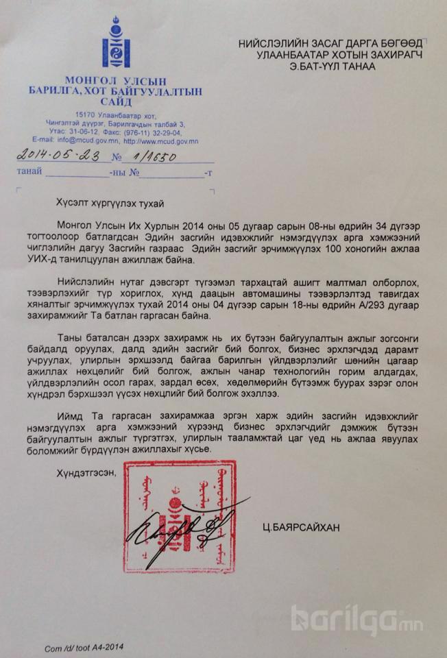Иймээс Барилга хот Байгуулалтын Сайд Ц.Баярсайхан хотын захирагч Э.Бат-Үүлд 5 сарын 23-ны өдөр хүсэлт хүргүүлсэн байна. Үүнтэй холбоотойгоор маргааш НИТХуралаар А/293 дугаар захирамжийг цуцлах талаар хэлэлцэхээр болсон байна.