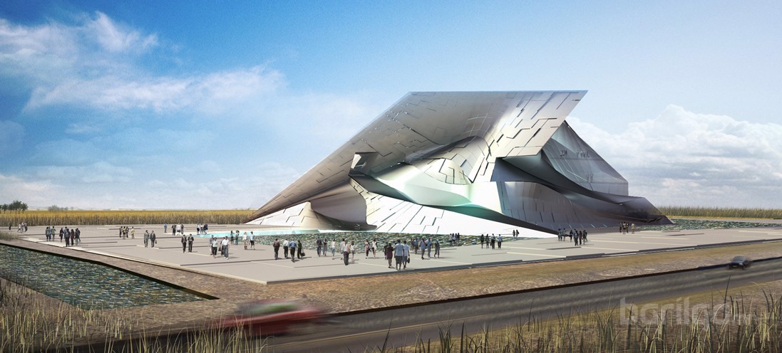 Барилга нь өөрөө монумент цогцолборыг бий болгоно. Орцны хэсгээс эхлэн тойрог хэлбэрийн налуу байдлаар дээш өгсөх музейн цөм байрлана. Гадна талд ч мөн адил налуугаар дээш өгсөх зам байх ба үүнийг музейд шигтгэмэл байдлаар суулгаж өгсөн. Үүний тусламжтай зам нь бага багаар өөрчлөгдөж эргэн тойрны орчны дэлгээсийг үзэж болно. Явган замын төгсгөл хэсэгт барилгын хойш харсан орой байрлах ба үүнээс хоёр дахь орц эхэлнэ. Жуулчид музейн доторхыг зөвхөн газар доороос биш дээрээс нь ч эхлэн үзэх боломжтой.
