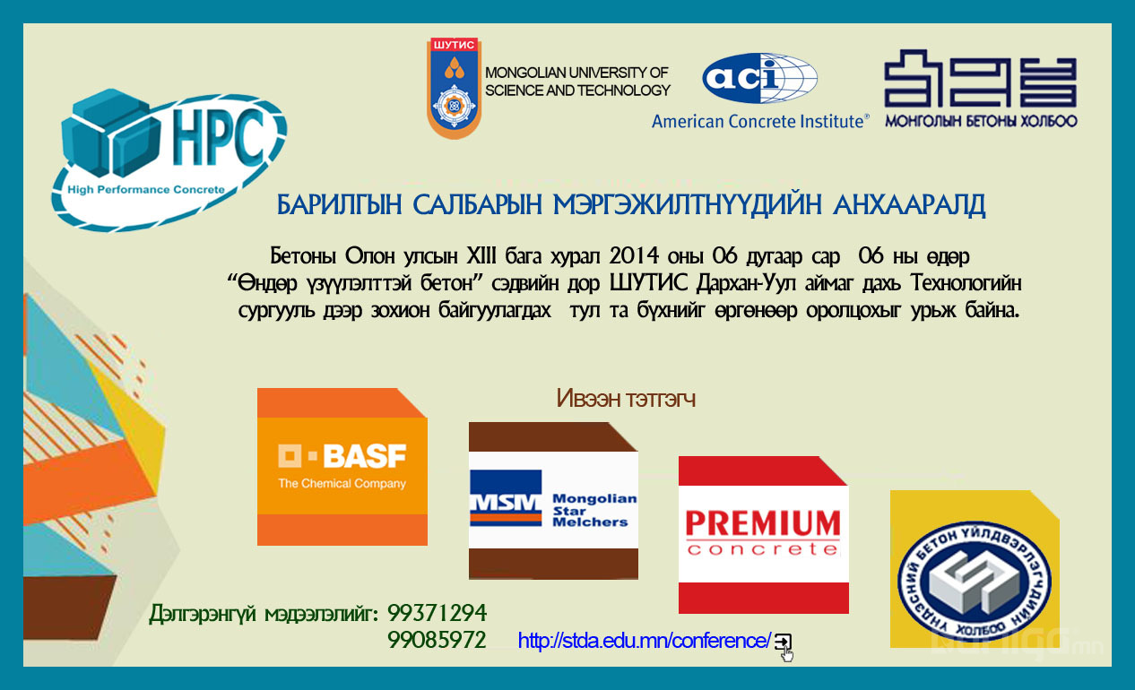 Энэ сарын 04-06 өдрүүдэд Дархан - Уул аймаг дахь ШУТИС-ийн Технологийн сургууль дээр “Бетоны олон улсын эрдэм шинжилгээний XIII бага хурал зохион байгуулагдана. Уг хурал жил бүр тогтмол болдог бөгөөд энэ удаагийн XIII хурлаар өндөр үзүүлэлттэй бетоны шинж чанар түүнд нөлөөлөх хүчин зүйлүүдийн талаар эрдэмтэн судлаачид, бетон үйлдвэрлэгч аж ахуйн нэгж болон Америкийн Бетоны Институтийн профессор MR. Hansen, Luke Snell, Хятадын “Синома” судалгааны институтийн профессор Sui Tongbo нар оролцож илтгэл хэлэлцүүлнэ. Уг хуралд оролцохыг хүсвэл 60,000 төгрөгийн хураамж төлбөр тушаана.
