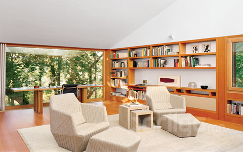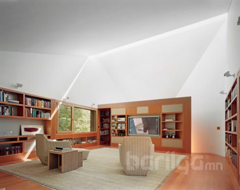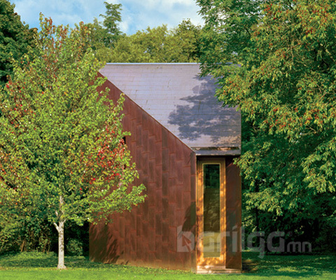 Нэгэн түүхчийн олон удаа шагнал хүртсэн номнуудыг дэлгэн харуулахыг зорьсон энэхүү авсаархан байшинг барихад ердөө 850 ам. дөрвөлжин талбай зарцуулсан. Нью Иорк хотын Лонг Айландад баригдсан уг байшин нь номын сан, зохиол бичих, ном унших, хөгжим сонсох гээд оюуны бүтээл туурвих бүх боломжийг бүрдүүлсэн сууц юм. Улирлын олон өнгө аяст барилгын зэс өнгөлгөө бүхий фасад гайхалтай зохицсон. Мөн ар талын урвуу гурвалжин хэлбэрт зохицсон модон хаалга хийж өгчээ.