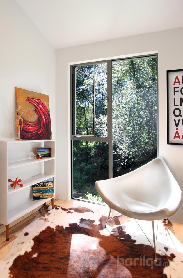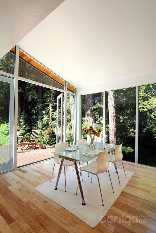Шилэн хана болон хаалга нь байгалийн гэрлийг чөлөөтэй нэвтрүүлэх төдийгүй гадна орчинг харахад туслана. Мөн гүйдэг хаалга хийснээр гадна болон дотор орон зайн заагийг уусгаж өгчээ.