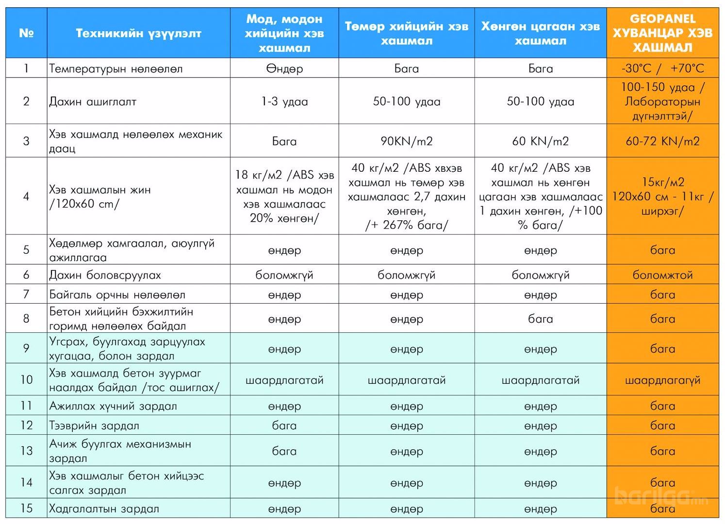 Тэгвэл “GEOPANEL ABS” хуванцар хэв хашмалыг барилга угсралтанд ашигласнаар бетоны бэхжилтийг технологийн дагуу илүү бат бөх чанартай болгох юм. Өөрөөр хэлбэл хуванцар хэв хашмал нь бетоны усыг гадны нөлөөллөөс хамгаалан ууршуулахгүй, бэхжих хүртэл нь удаан барьж чаддаг байна. Хуванцар хэв хашмал хэрэглэснээр бетон бүтээцийн чанар, хөдөлмөр зарцуулалт, материал болон эдийн засагт ихээхэн хэмнэлт гардгийг дараах хүснэгтээс харж болно.
