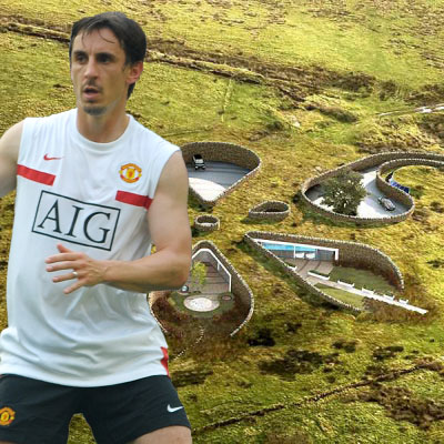 Gary Neville байгальд ээлтэй, тансаг сууц бариулах төлөвлөгөөтэй байсан ч хөршүүдийн эсэргүүцлээс болж эко сууцаа дуусгаж чадахгүйд хүрч байв. Салхин сэнс, нарны эрчим хүч хуримтлуулагч хавтан зэрэг байгальд ээлтэй, сэргээгдэх эрчим хүч ашиглахаар төлөвлөж байсан 5 унтлагын өрөөтэй газар доорх энэ сууцаа барих газрыг 7 жилийн өмнө 8 сая фунтээр худалдан авч байжээ.