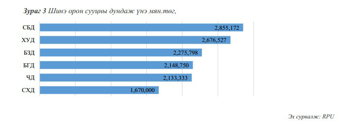 Шинэ орон сууцны дундаж үнийг дүүргээр авч үзэхэд хамгийн өндөр үнэтэй дүүргээр нийслэлийн Сүхбаатар дүүрэг 11-р сарын байдлаар 2,855 мянган төгрөгийн дундаж үнэтэй, Хан-уул дүүрэг 2,676 мянган төгрөгийн дундаж үнэтэй, Баянзүрх дүүрэг 2,275 мянган төгрөгийн дундаж үнэтэй байгаа бол бусад дүүргийн шинэ орон сууцны дундаж үнэ 2.15 саяас доош үнэлгээтэй гарлаа.