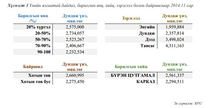 Зах зээл дээр борлуулалт хийж буй ашиглалтанд орсон болон ашиглалтанд ороогүй орон сууцны 1м2–н дундаж үнийг авч үзэхэд энэ оны 11-р сарын байдлаар 2,358 мянган төгрөг байна.