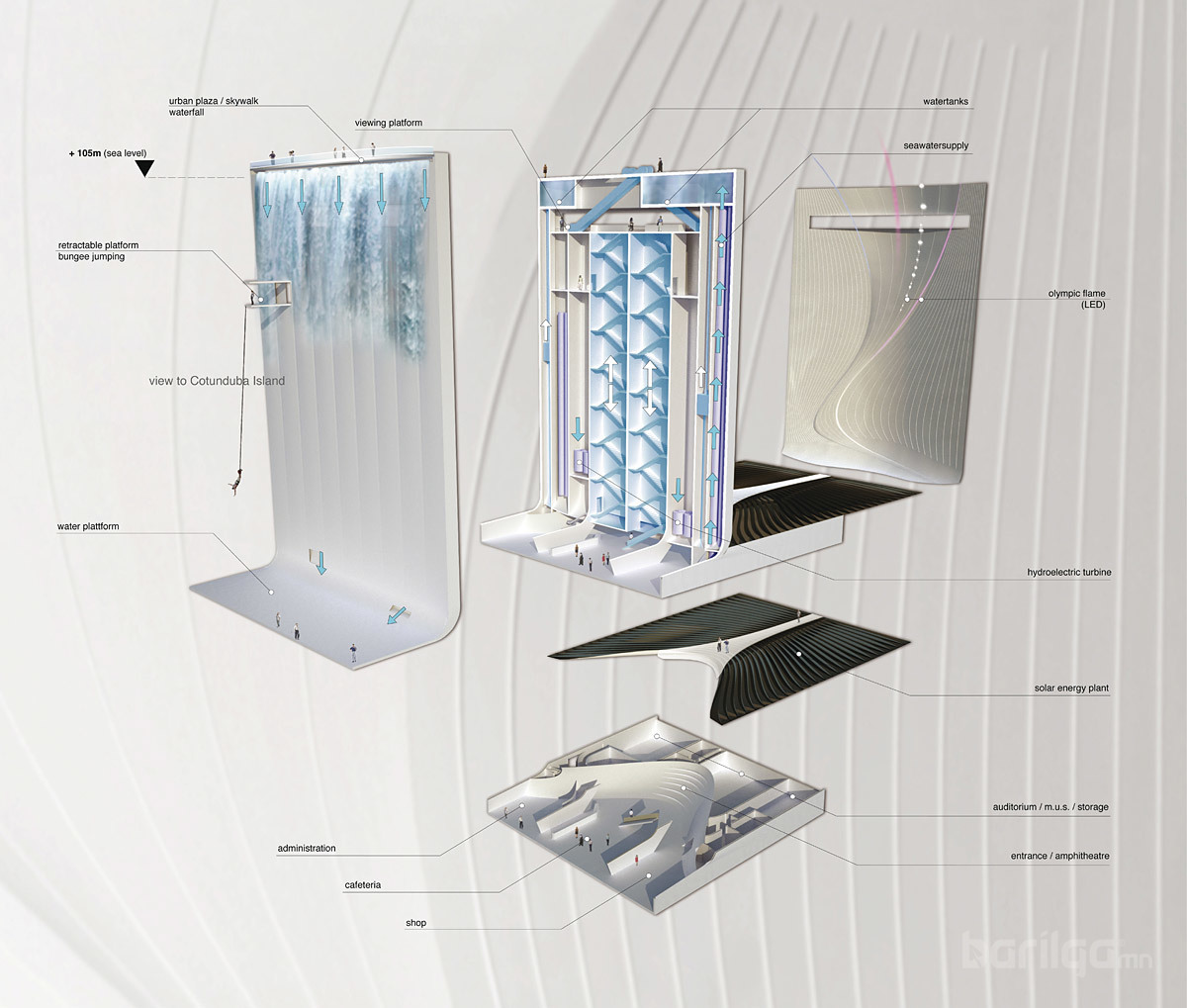 Олимпийн тосгонд нарны эрчим хүчний цахилгаан станцууд мөн бий болох юм. Уг цогцолбор нь олон талаар хувирах боломжтой өдөр нь хүрхрээ, шөнө нь сүрлэг цогцолбор барилга болох юм. Дотроо өндөр зэрэглэлийн ресторан, брендүүдийн дэлгүүр, амралт аялалын бааз гэх мэт олон төрлийн үйлчилгээ байна. Өндрөөс үсрэхэд зориулагдсан эвхэгддэг тавцан, далайг ширтэн суух ажиглалтын тавцан гэх мэт шилэн дээвэртэй тул хүрхрээг доороос нь харж болно. Барилгын ажил 2016 онд бүрэн дуусах юм .