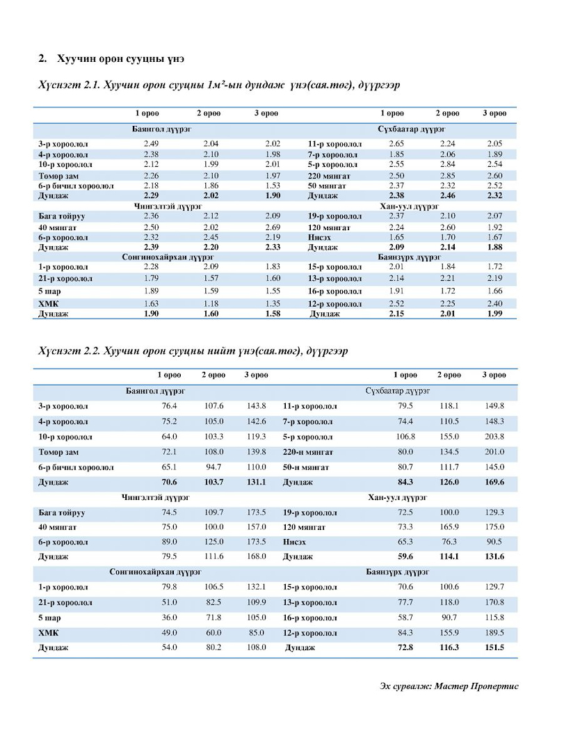 Master properties үл хөдлөх хөрөнгийн судалгааны багаас сар бүр орон сууцны үнийн тоймыг гаргадаг . Энэ оны 9 сарын байдлаар шинэ ба хуучин орон сууцны үнийн тойм судалгааг хүргэж байна.