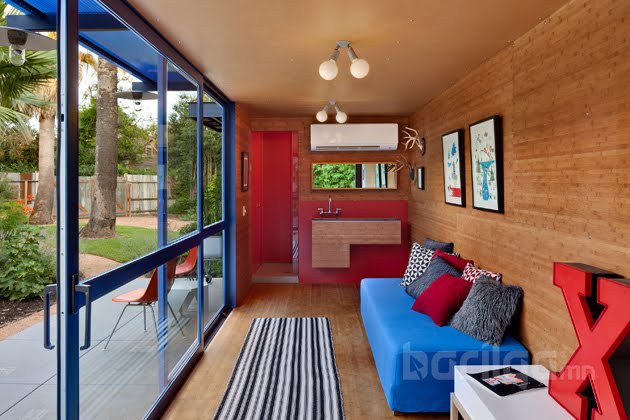 контейнерийг сонгон авч, 3н тасалгаанд хувааснаар гол өрөө, ариун цэврийн өрөө, агуулахын зориулалтаар гэсэн 3 өрөө болгон өөрчилжээ. Гол өрөөнд нь шалнаас тааз хүртэлх өргөн шилэн гүйдэг хаалга суулган, контэйнерийн төмөр хаалганы оронд шилэн хана хийсэн төдийд л авсаархан зуны сууц болжээ. Уг