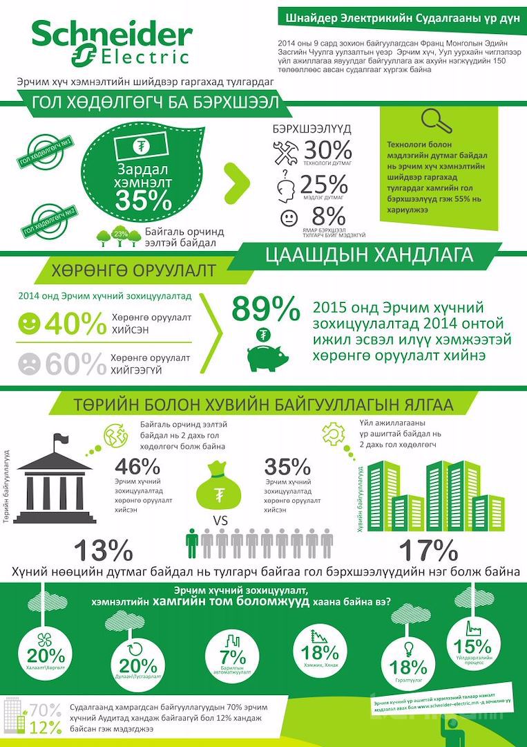 Тухайлбал: Уг судалгаагаар эрчим хүчний хэмнэлтийн шийдвэр гаргахад технологи, мэдлэгийн дутмаг байдал хамгийн их нөлөөлдөг гэсэн дүгнэлт гарсан байна.