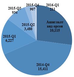 Ашиглалтад орон хугацаанаас хамааруулан 1м2-ын дундаж үнийг харьцуулбал ашиглалтанд орсон төслүүдийн дундаж 2,428 мян.төг 2014 оны 4-р улирлынх 2,180.9, 2015 оны 1-р улирлынх 2,335.8, 2-р улирлынх 2,787.9, 3 улирлынх 1,897.1, 4-р улирлынх 2,866.0, 2016 оны 1-р улирлынх 1,490.0 байна. Ашиглалтад орсон орон сууцны хувьд одоо баригдаж байгаа, дараагийн улирлуудад ашиглалтад орох орон сууцтай харьцуулахад өндөр үнэтэй байх хандлага ажиглагдаж байна.