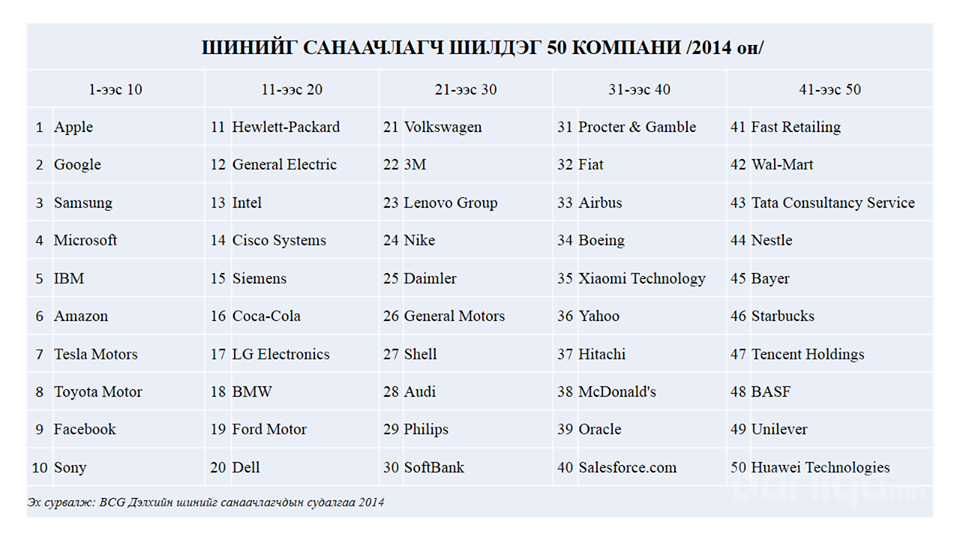 Boston Consulting Group нь 2014 оны Дэлхийн шилдэг шинийг санаачлагч 50 компанийн жагсаалтыг гаргасан байна. Технологийн салбарт манлайлагч Apple пүүс уг жагсаалтыг сүүлийн 9 жилийн хугацаанд тасралтгүй тэргүүлсэн хэвээр байгаа юм. Харин Google өнгөрсөн жилийн үзүүлэлтээсээ дээшилж, Samsung-ийг гүйцэж түрүүлснээр жагсаалтын хоёрдугаарт оржээ. Тиймээс Өмнөд Солонгосын Samsung корпораци энэ удаад 3-рт жагссан байна.