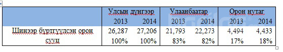 Өнөөдөр Улаанбаатар хотод 3 сая Монголчуудын маань бараг 1.3 сая буюу 45% нь амьдарч байна. Улсын хэмжээний ихэнх барилга, орон сууц Улаанбаатар хотод баригдаж байгаа гэж хэлж болно. Учир нь 2013, 2014 онд шинээр ашиглалтанд орж, бүртгүүлсэн орон сууцны 82 хувь нь Улаанбаатар хотод байна. Бусад 18 хувь нь хөдөө орон нутагт байсан.
