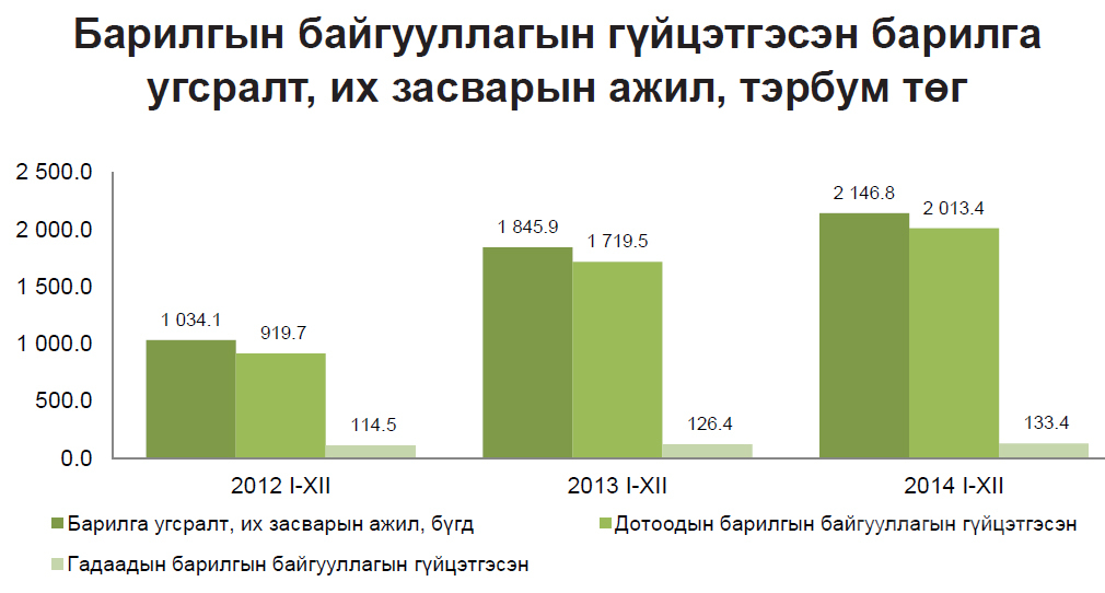 90-ээс дээш хувийг дан дотоодын барилгын байгууллагууд гүйцэтгэсэн харагддаг. Энэ нь зөвхөн 2014 онд биш, бас 2012, 2013 гээд өнгөрсөн онуудад ч гэсэн адил байсан. Манай улс барилгын материалын хувьд дийлэнх нэр төрлийг гаднаас авдаг. Энэ талаар манай Монголын Бизнес Хөгжлийн Холбооноос судалгаа хийж байгаа.