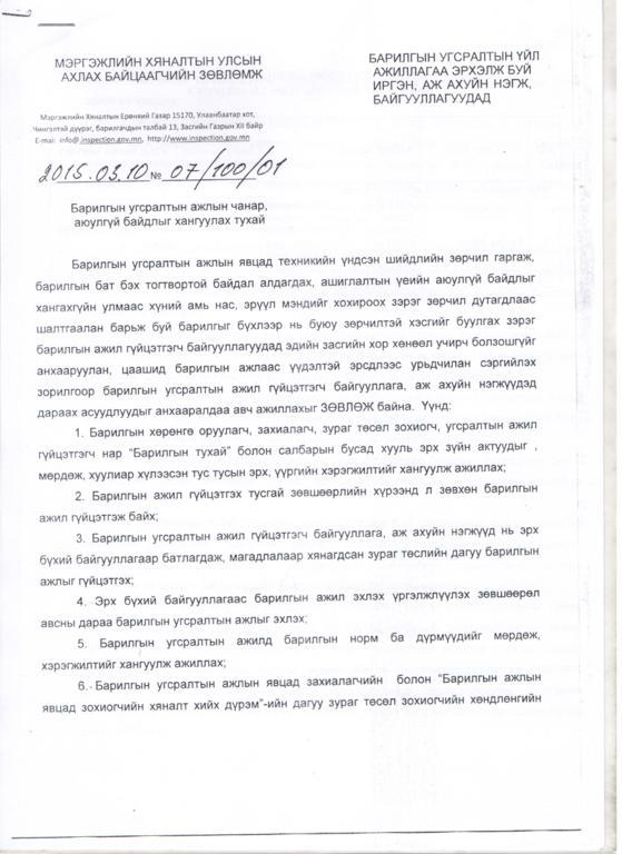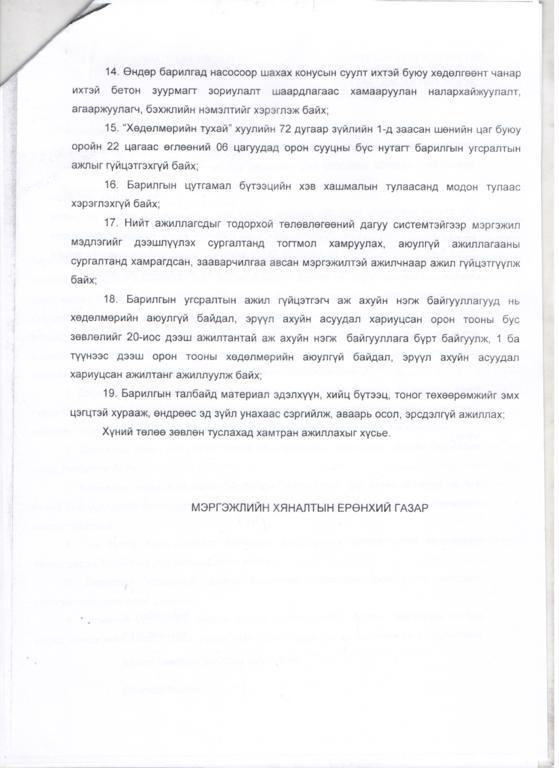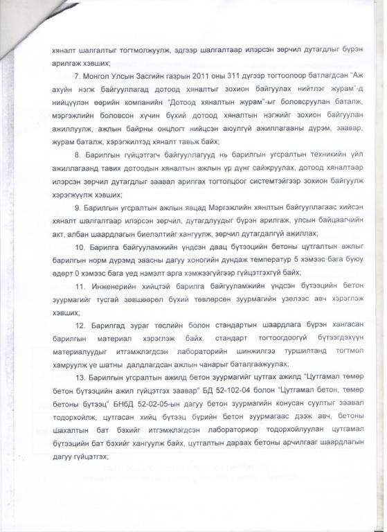 Мөн компани өөрийн дотоод хяналтын журмыг боловсруулж, хэрэгжүүлэх, бетон цутгалтын ажлыг тэг хэмээс бага үед нэмэлт арга хэмжээгүйгээр гүйцэтгэхгүй байх, үндсэн бүтээцийн зуурмагыг төвлөрсөн зуурмагийн узелээс авч хэрэглэх, Хөдөлмөрийн тухай хууль зааснаар орон сууцны бүс нутагт оройн 22 цагаас өглөөний 06 цагуудад барилга угсралтын ажил явуулахгүй байх, хөдөлмөрийн аюулгүй байдал хариуцсан ажилтныг тогтмол ажиллуулж, ажилчдыг сургалтад хамруулах зэрэг асуудлыг тусгасан байна.