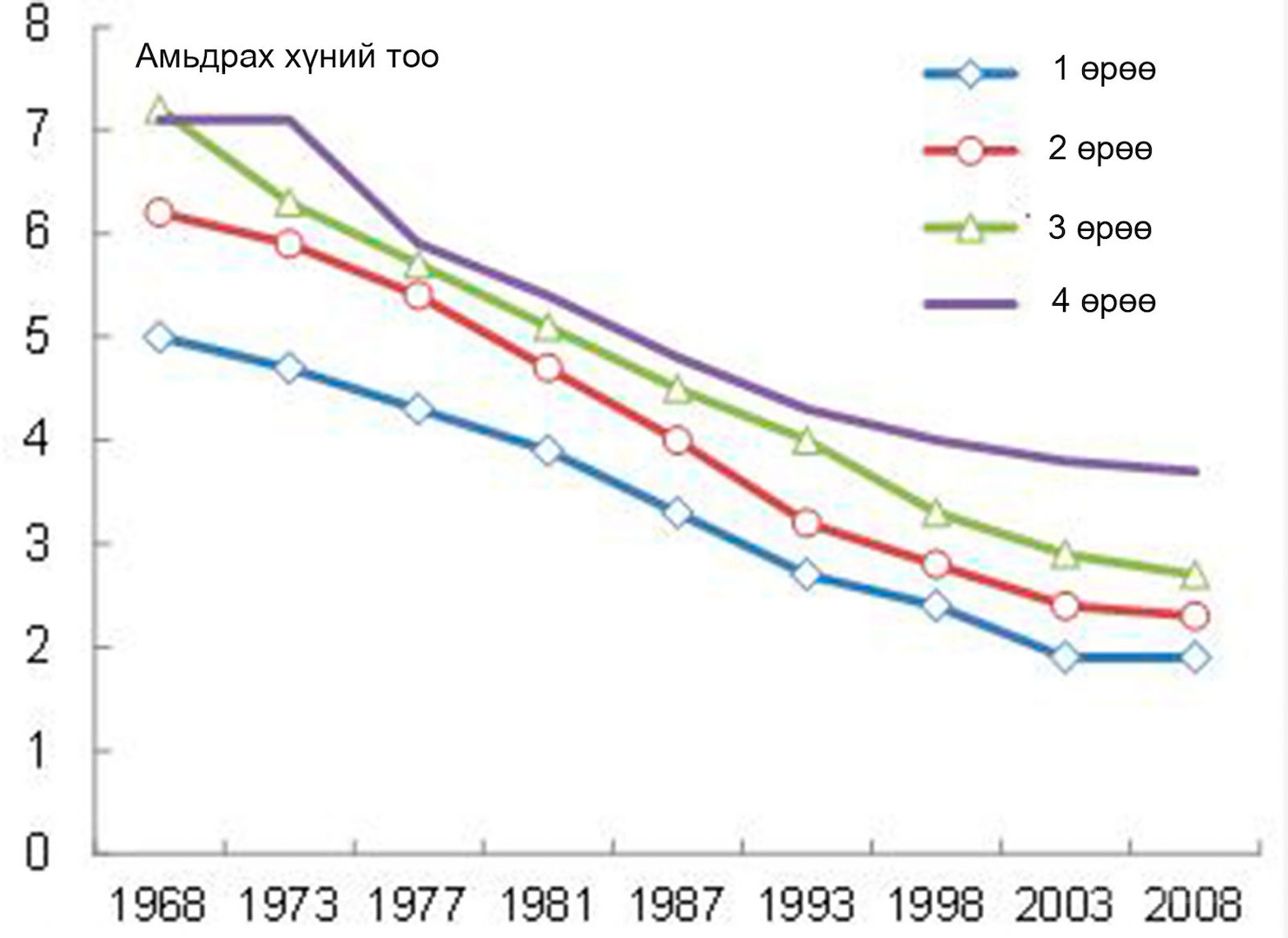 Нэг байранд амьдрах хүмүүсийн тоо. 1968-2008 он. Эх сурвалж: Housing & Development Board of Singapore