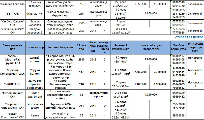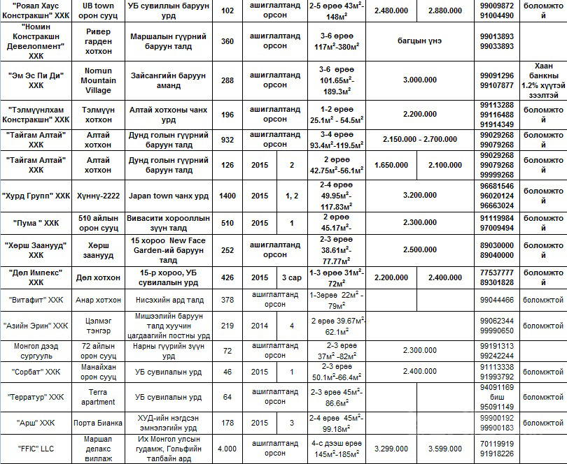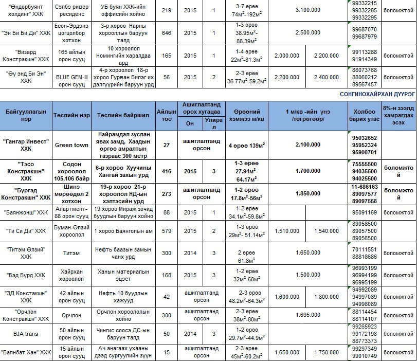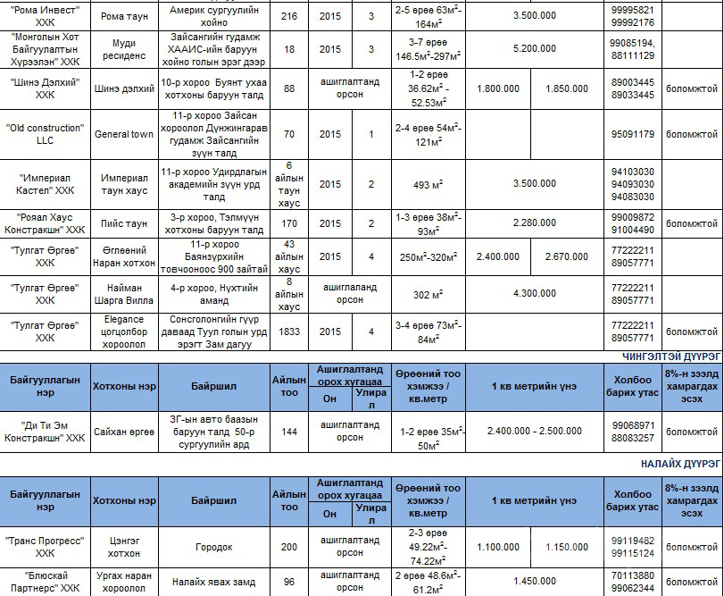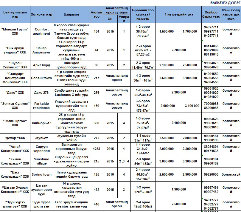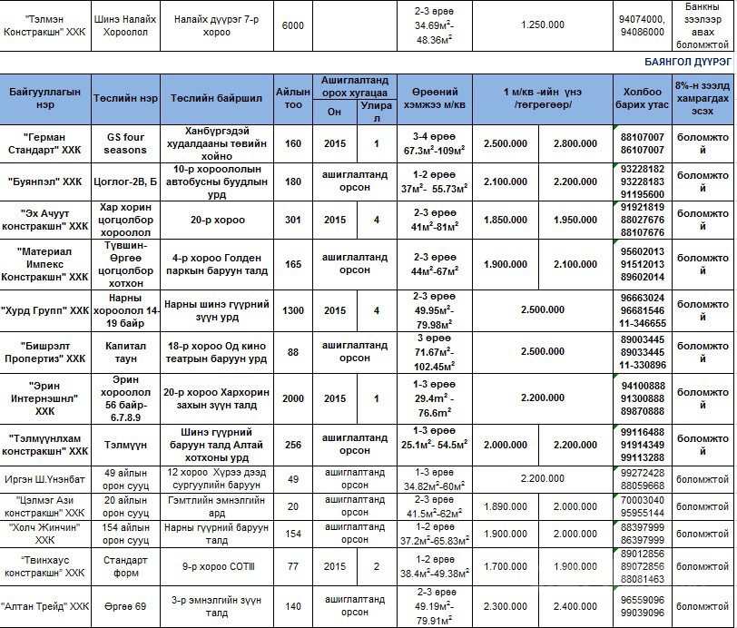 Барилга.мн сэтгүүлээс сар бүр гаргадаг шинэ орон сууцны үнэ ханшийн судалгааг хүлээн авна уу. 2015 оны 2 сарын байдлаар Улаанбаатар хотын Налайх, Сонгино-Хайрхан, Сүхбаатар, Баянгол, Баянзүрх, ХанУул, Чингэлтэй дүүргүүдэд