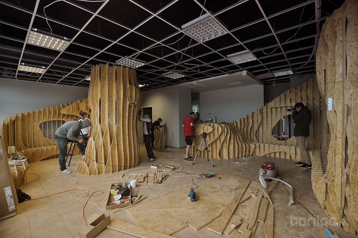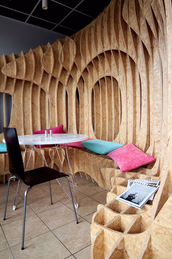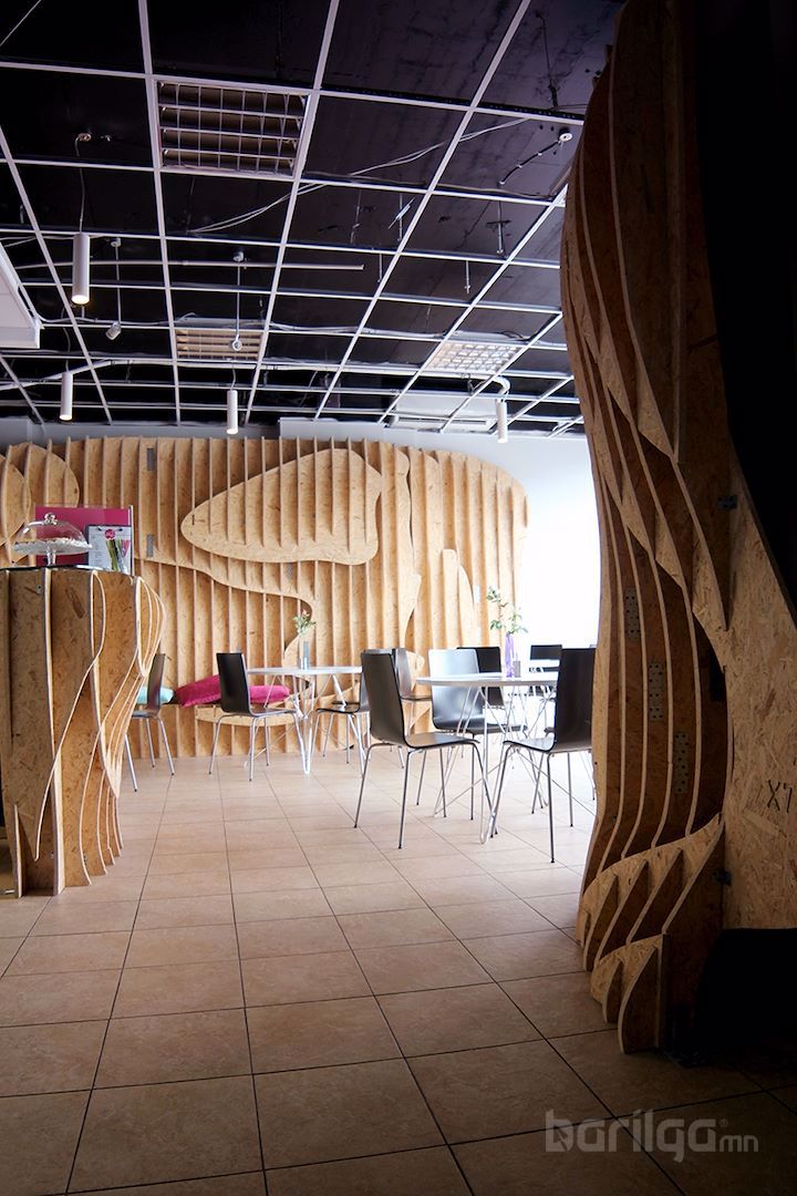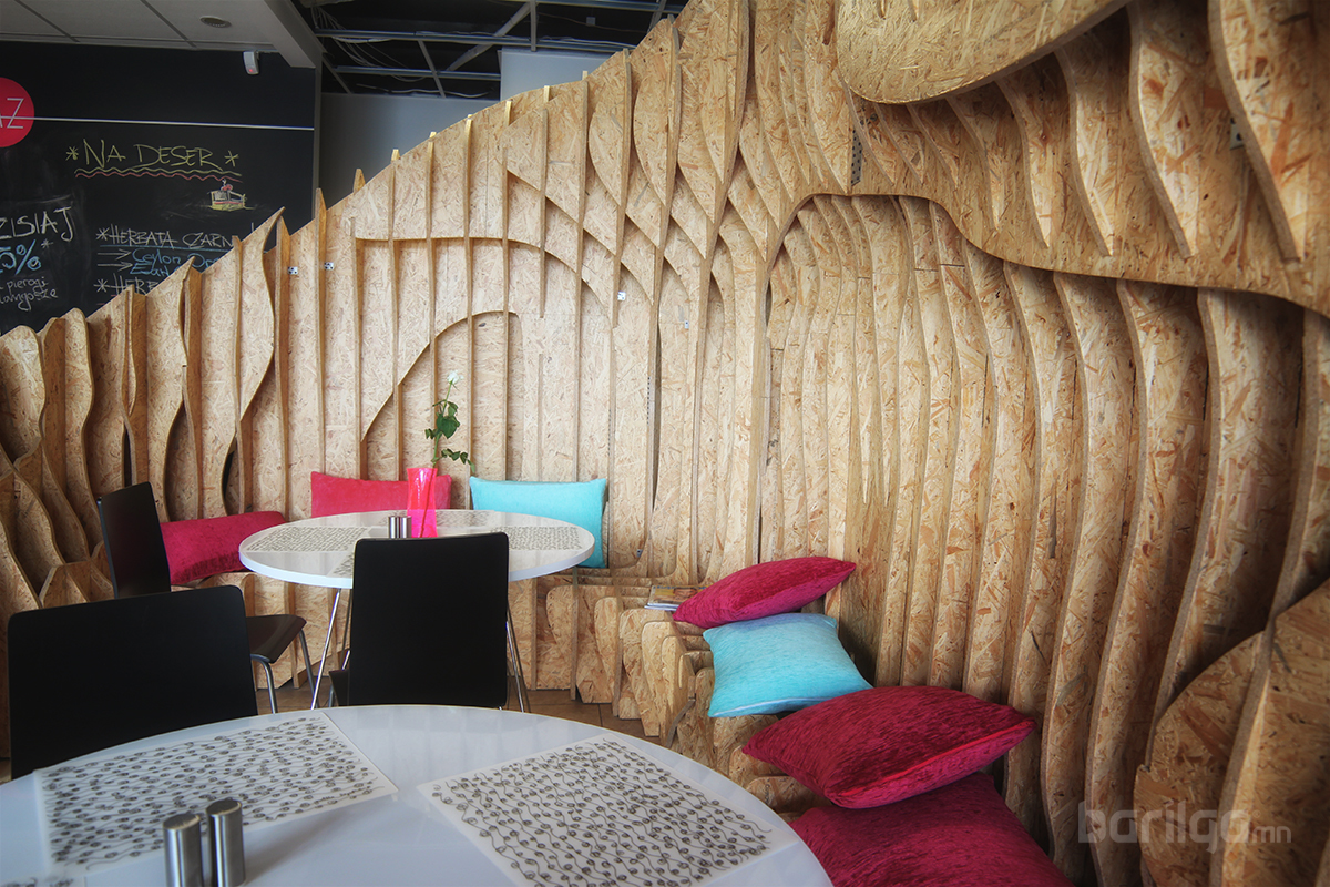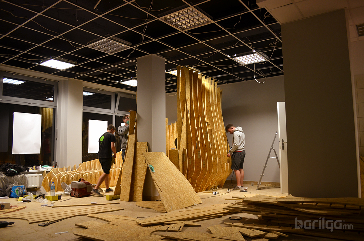 Польшийн Барилгын Политехникийн оюутнууд сургуулийхаа үүдний хэсгийг ДСП хавтан ашиглан уусгалттай дизайн гаргаж энгийн нэг үүдний коридорийг шинэчлэн засварлажээ. Материалын хувьд ДСП хавтанг будаж янзлалгүй өөрийх нь оргинал өнгөөр нь хийж өгсөн нь энгийн атлаа маш дизайнтай харагдаж байна.