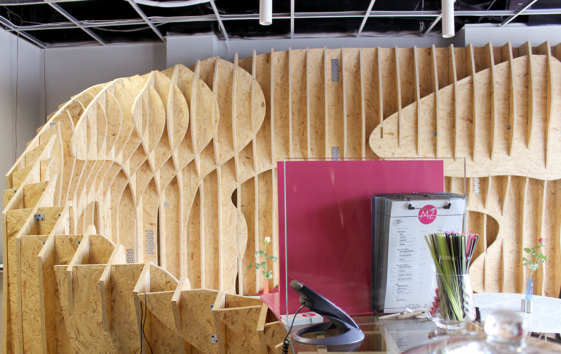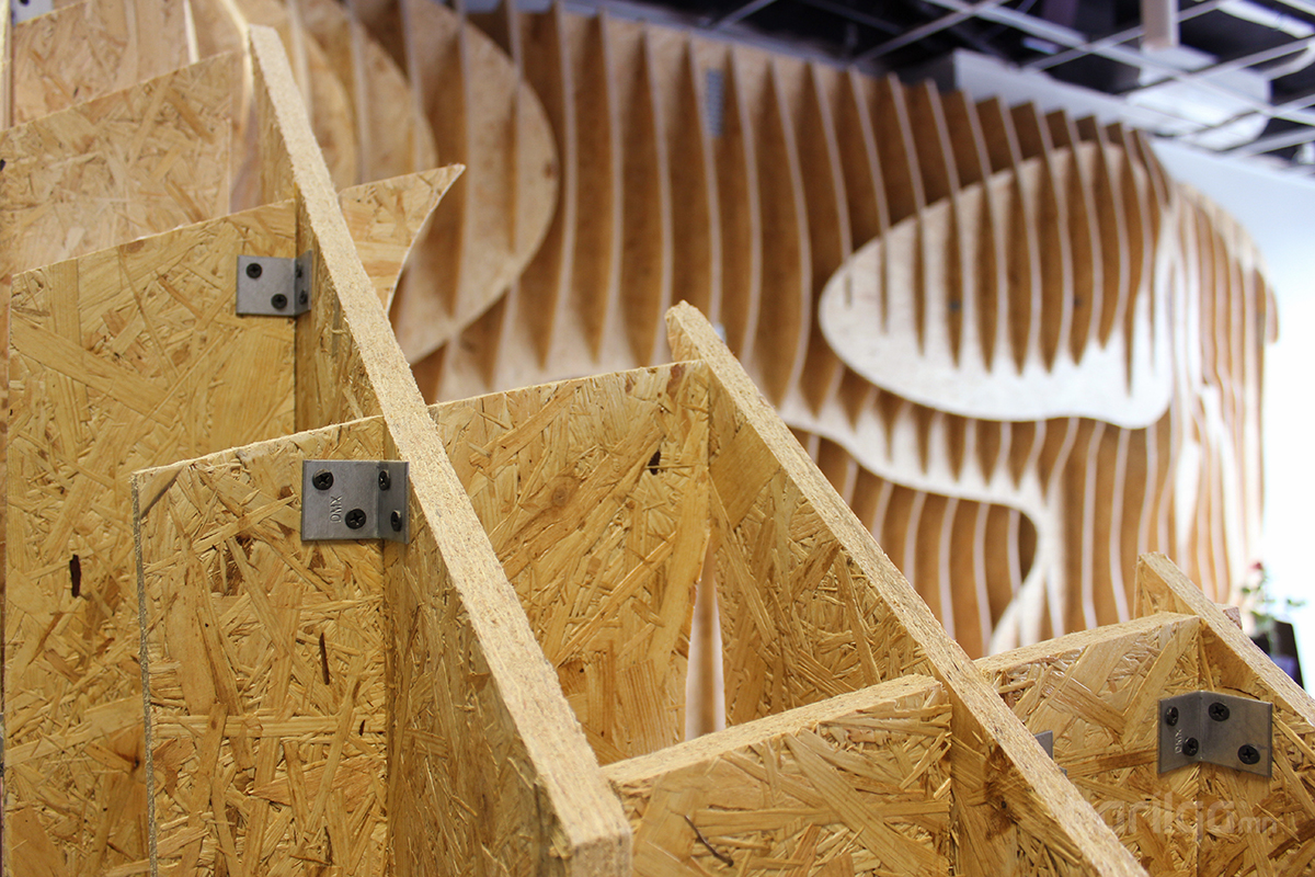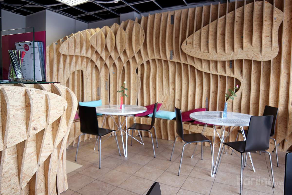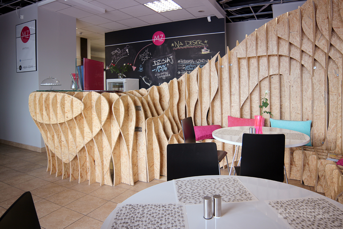 Польшийн Барилгын Политехникийн оюутнууд сургуулийхаа үүдний хэсгийг ДСП хавтан ашиглан уусгалттай дизайн гаргаж энгийн нэг үүдний коридорийг шинэчлэн засварлажээ. Материалын хувьд ДСП хавтанг будаж янзлалгүй өөрийх нь оргинал өнгөөр нь хийж өгсөн нь энгийн атлаа маш дизайнтай харагдаж байна.