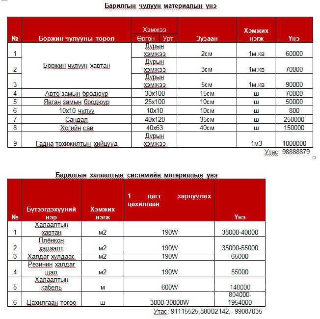 Урин хаврын өдрүүд ирж, барилгын салбарыхан хөл хөдөлгөөнд орж, бэлтгэл ажлаа хангаж байгаа нь лавтай. Энэ үед барилгын ажил эхлэж, материалын үйлдвэрлэл ч дагаад өрнөдөг. Барилгын салбарын хамгийн чухал хүчин зүйл бол барилгын материал байдаг тул Барилга.мн сайт сар бүр нийслэлийн хэмжээнд борлуулагдаж буй материалын үнэ ханшийн судалгааг хийдэг. 2015 оны 4 сарын байдлаар барилгын материалын үнэ ханш ямар ханштай байгааг хүргэж байна.