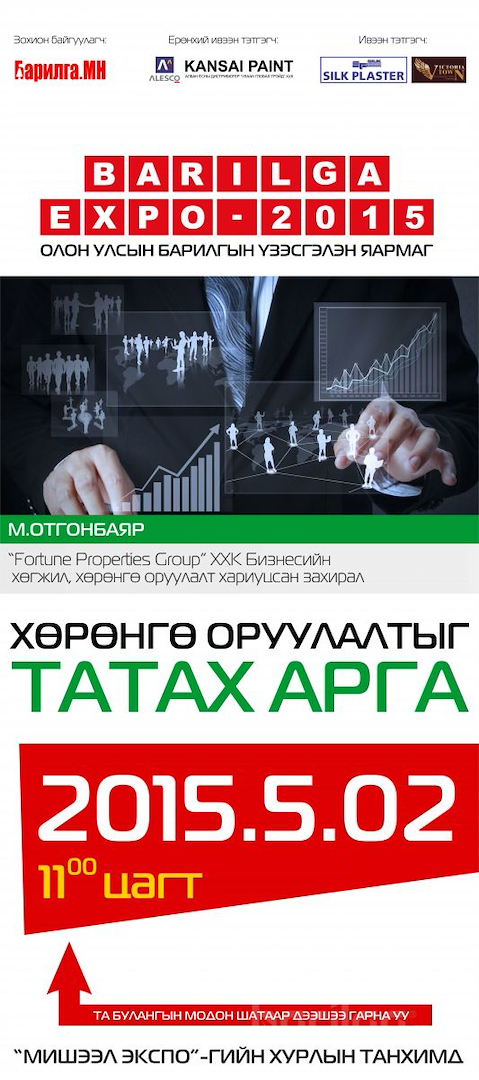 “BARILGA EXPO 2015” олон улсын үзэсгэлэн яармаг 8 дахь жилдээ амжилттай зохион байгуулагдах гэж байна. Үзэсгэлэн яармаг 2015 оны 4-р сарын 24-нөөс 26-нд “БАРИЛГЫН МАТЕРИАЛ”, 2015 оны 5-р сарын 1-нээс 3-ны өдрүүдэд “ОРОН СУУЦ, Үл хөдлөх хөрөнгө” гэсэн хоёр ангилалаар болно.