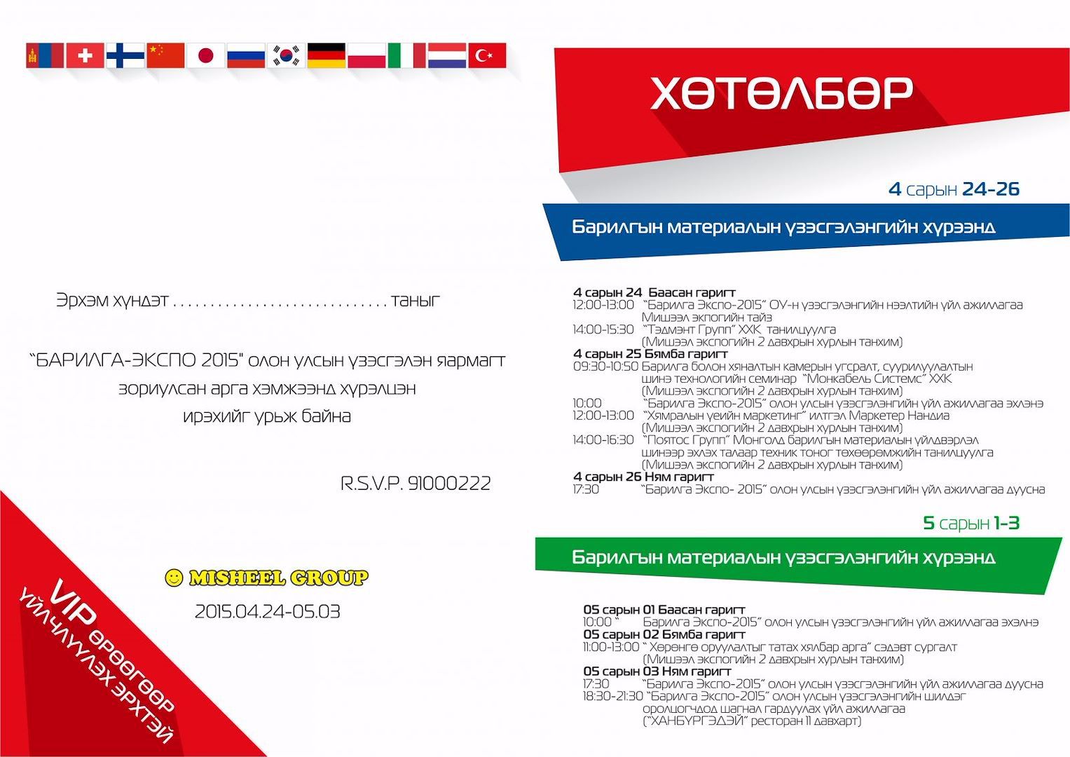 “BARILGA EXPO 2015” олон улсын үзэсгэлэн яармаг 2015 оны 4-р сарын 24-26-ны өдрүүдэд Барилгын материалын үзэсгэлэн, 2015 оны 5-р сарын 1-3-ны өдрүүдэд Үл хөдлөх хөрөнгө, Орон сууцны үзэсгэлэн гэсэн хоёр ангиллаар "Мишээл-Экспо" төвд үргэлжилнэ.
