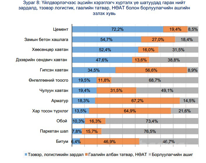 Иргэд барилгын материалыг дотооддоо үйлдвэрлэж буй учир илүү хямд үнэтэй байх ёстой мэт ойлгодог боловч зарим бараа, материалын хувьд импортын бүтээгдэхүүнээс өндөр үнэтэй байх нь бий. Үүнийг үйлдвэрлэгчид үйлдвэрлэлийн хүчин чадал болон түүхий эд материалын нь үнэтэй холбон тайлбарладаг. Шалтгаан нь тодорхой юм. Дотоодын үйлдвэрийн бараа, материалын түүхий эдийг ихэвчлэн импортоор авч байгаатай холбогдон бараа, материал импортлогчдод тулгардаг валютын ханшны өсөлт, тээвэрлэлтийн зардал зэрэг асуудлууд үүсч байгаа нь үнэд нөлөөлдөг байна. Сүүлийн жилүүдэд үндэсний үйлдвэрлэгчдийг дэмжих тал дээр бид эрс сайжирсан. Үндэсний үйлдвэрлэлийг сонгож хэрэглэх хамгийн том давуу тал бол тухайн бүтээгдэхүүн нь буух эзэн буцах хаягтай болсноороо илүү баталгаатай юм.