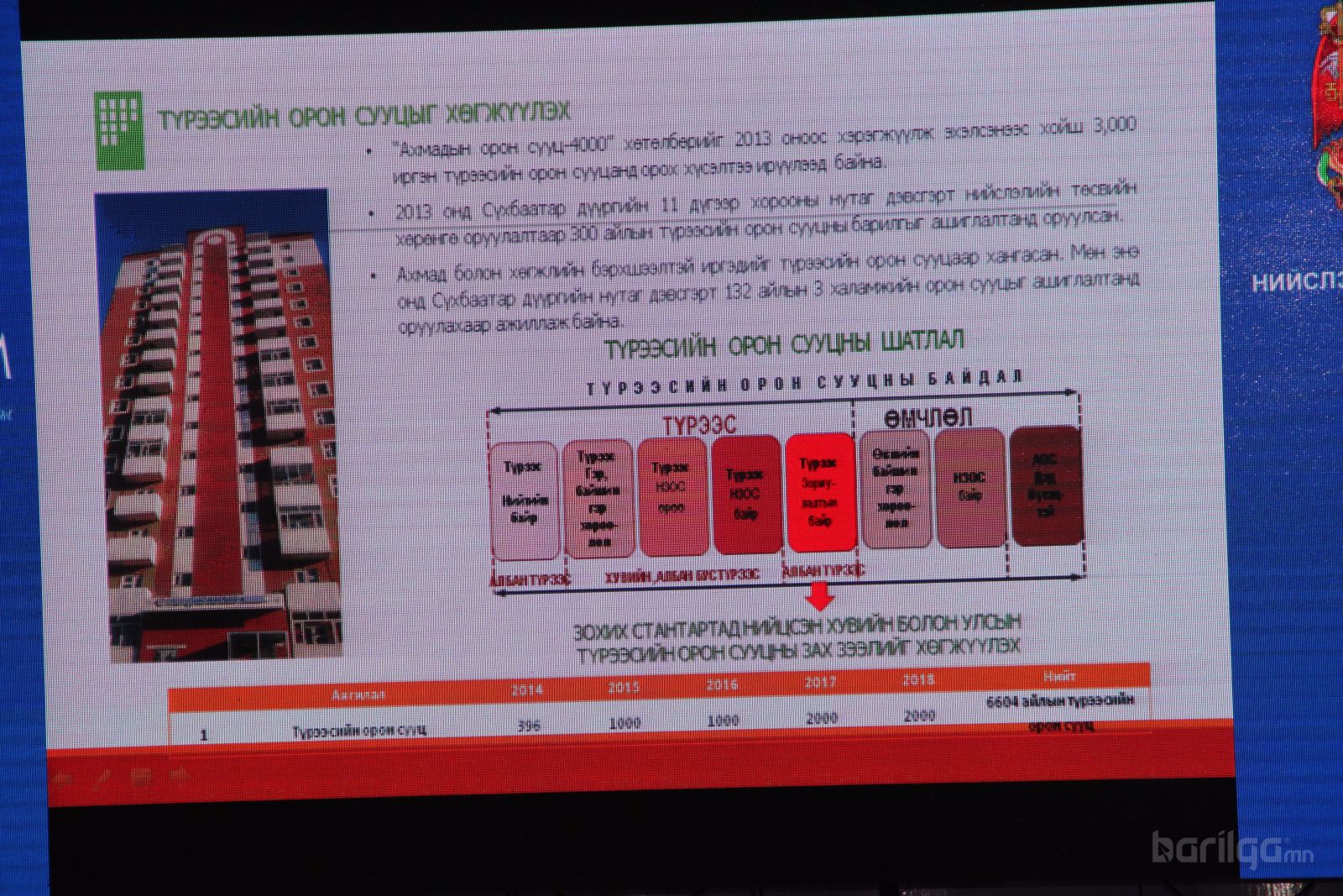 Түрээсийн орон сууц 2016 он хүртэл 1000 айл, 2016 оноос 2000 айлын орон сууцыг ашиглалтанд оруулна.