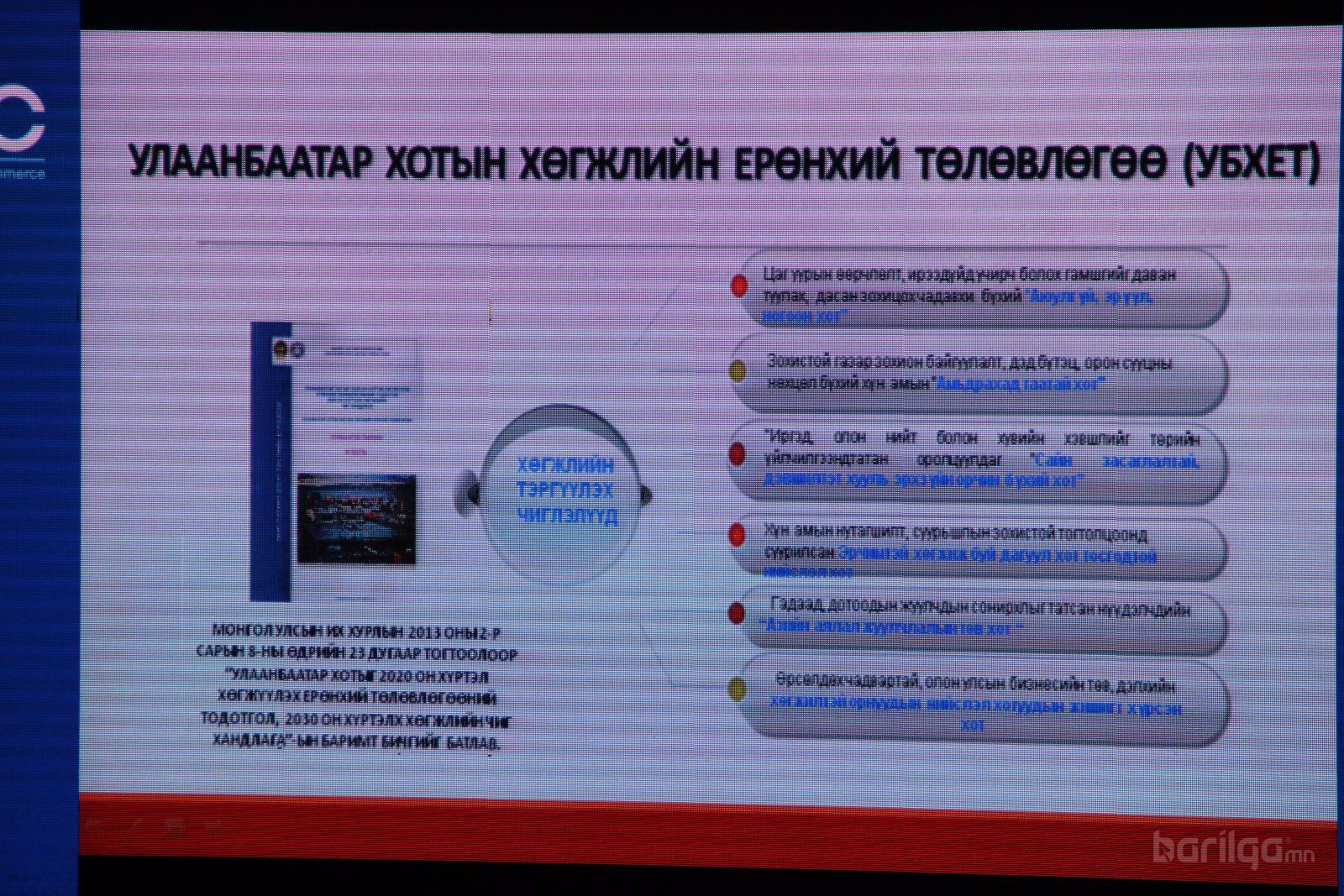 Тэрээр "Улаанбаатар хот 1954 онд анхны ерөнхий төлөвлөгөөгөө баталж хэрэгжүүлснээс хойш 6 ерөнхий төлөвлөгөөг дамжин өнөөдрийн дүр төрхтэй хотыг хамтран цогцлоон бүтээж явна. Бид 6 дахь ерөнхий төлөвлөгөөг Японы Жайка байгууллагын тусламжтайгаар хамтран олон улсын хэмжээнд санхүүгийн болоод өндөр мэргэжилтнүүдийн оролцоотойгоор боловсруулж анх удаа Монгол улсын их хурлаар батлуулж, өнөөдөр хэрэгжүүлээд явж байна.