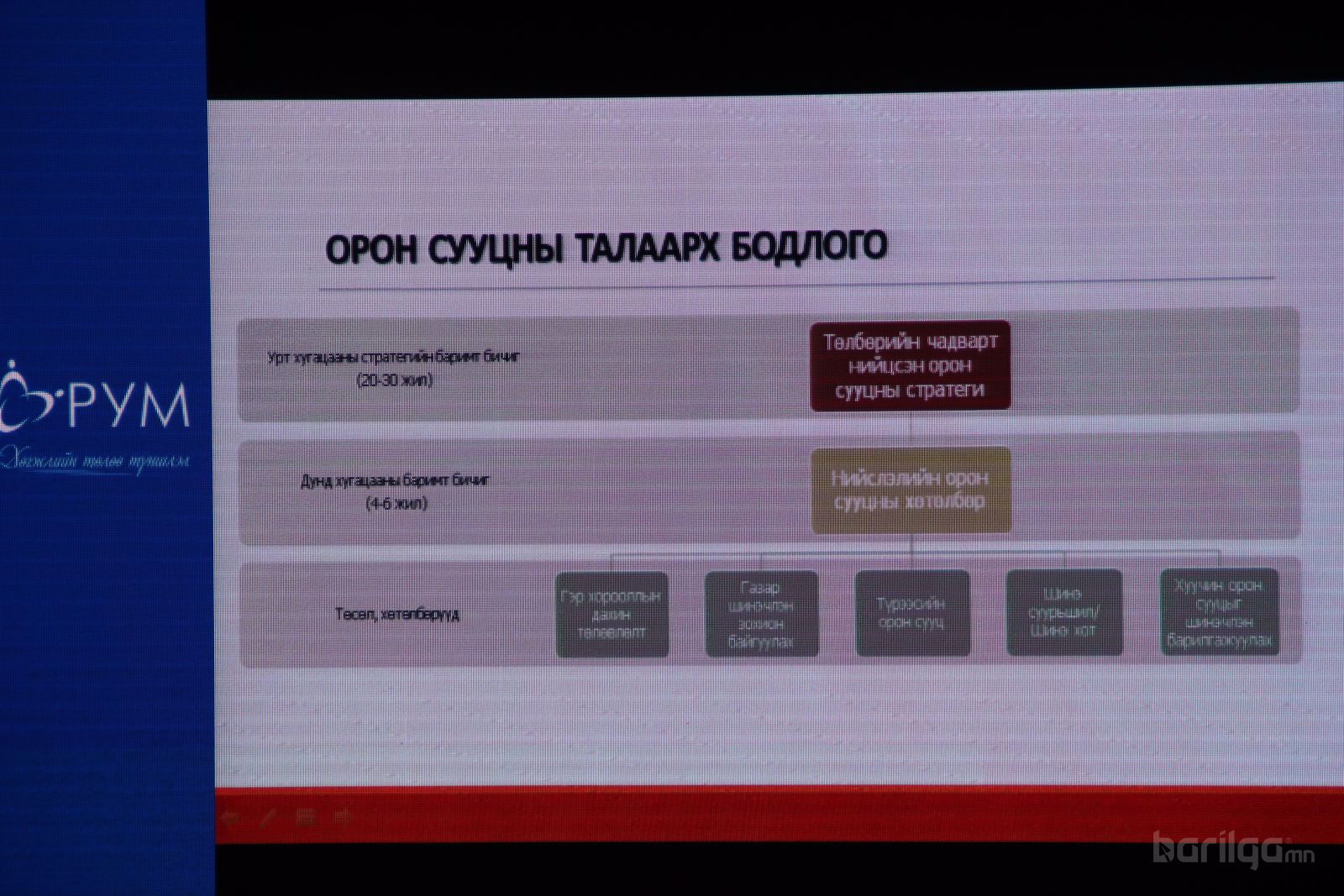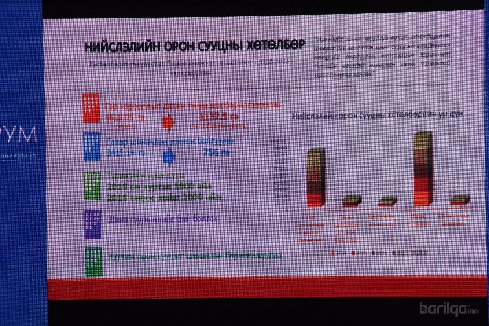 Иргэдийн төлбөрийн чадварт нийцсэн орон сууцны хөтөлбөрүүдийг хэрэгжүүлнэ. Үүнд: Гэр хорооллын дахин төлөвлөлт, Газар шинэчлэн зохион байгуулах, түрээсийн орон сууц хөтөлбөр, шинэ суурьшил шинэ хот, хуучин орон сууцыг дахин төлөвлөх зэрэг 5 чиглэлийн ажлыг урт хугацааны туршид хэрэгжүүлэхээр ажиллаж байна.