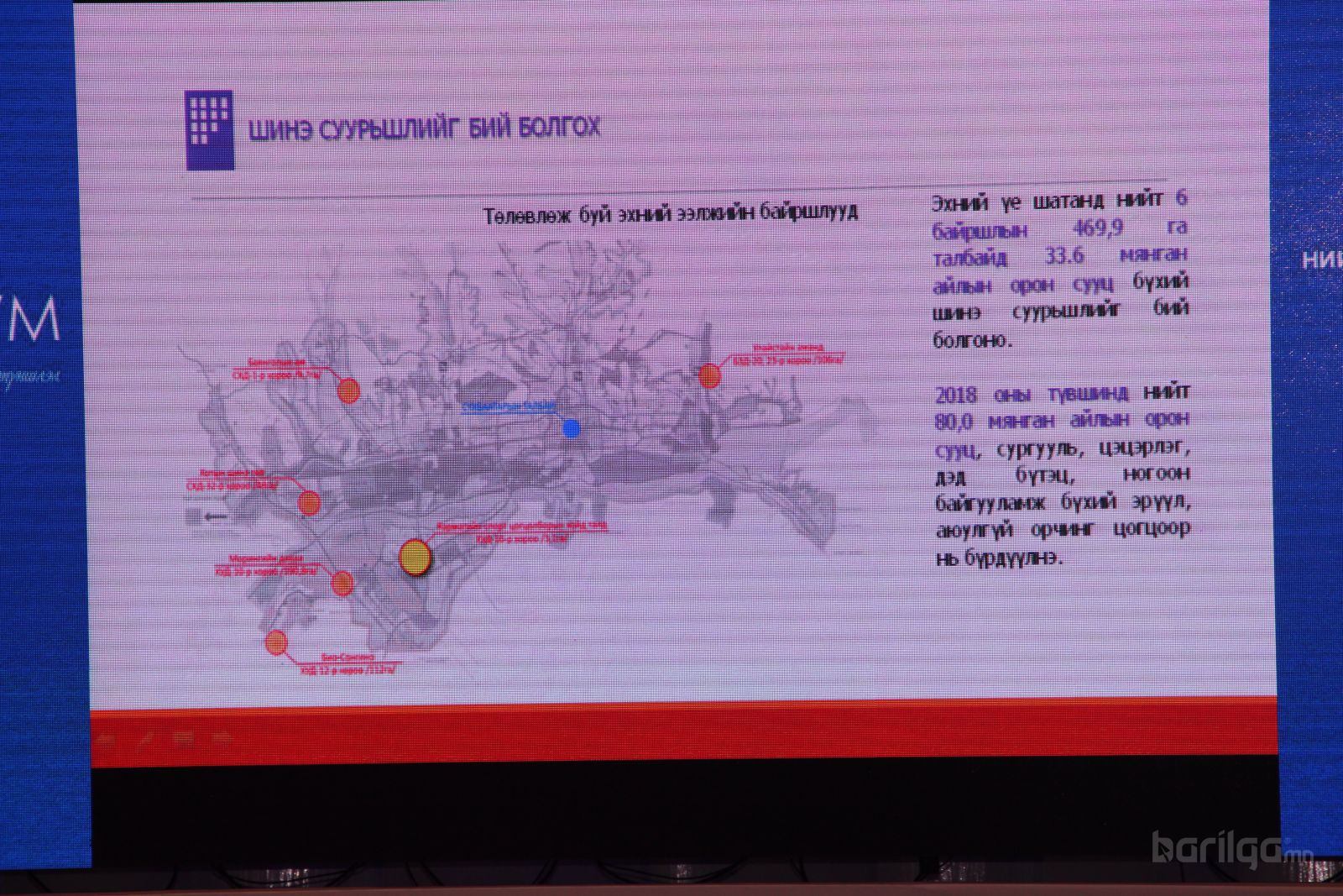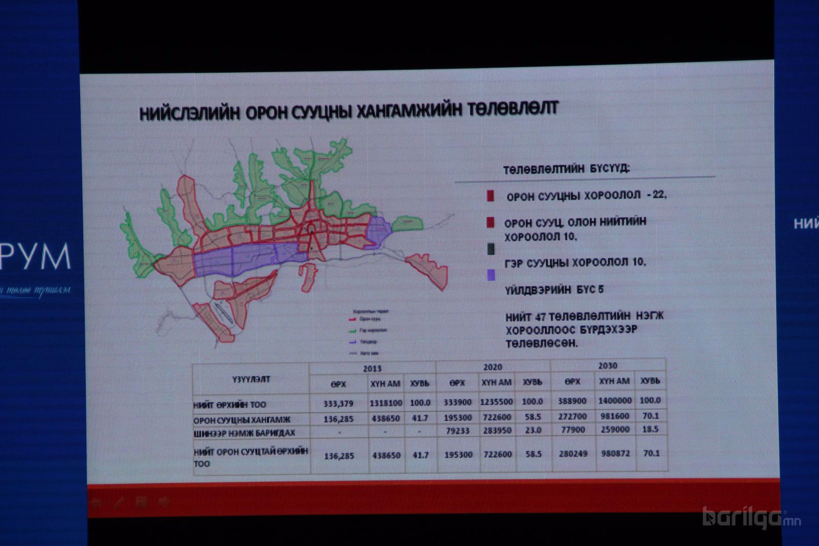 Нийслэлийн орон сууцны хангамжийн төлөвлөлтөөр орон сууцны хороолол 22, орон сууц, олон нийтийн хороолол 10, гэр сууцны хороолол 10, гэх мэтчилэн нийт 47 хорооллыг нийслэлийн бүсэд бий болгоно.