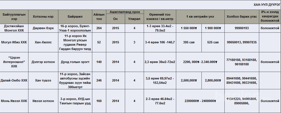 2015 оны 1 сарын байдлаар Улаанбаатар хотын хэмжээнд шинэ орон сууцны үнэ ханш ямар төлөвтэй байгаа талаар илүү дэлгэрэнгүй мэдээллийг " Барилга.мн" сэтгүүлийн 2 -р дугаар сарын шинэхэн дугаараас хүлээн авч үзнэ үү.