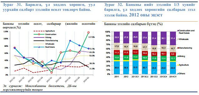 Бүх салбарт зээл өссөн боловч барилга, үл хөдлөх хөрөнгийн салбар болон уул уурхайн салбарт зээл илүү төвлөрсөн байна. 2014 оны 1 дүгээр улирлын байдлаар барилгын салбарт олгосон зээл 117.5 хувь, түүний дараа үл хөдлөх хөрөнгийн салбар (72.7 хувь), уул уурхайн салбар (63.2 хувь), бөөний/жижиглэнгийн худалдааны салбар (53.7 хувь) тус тус орж байна (Зураг 31). 2012 оны эцэст барилга, үл хөдлөх хөрөнгийн салбарын зээлийн эзлэх хувь 27 хувь байснаа 2014 оны 1 дүгээр улиралд 31.4 хувь болж өсчээ.
