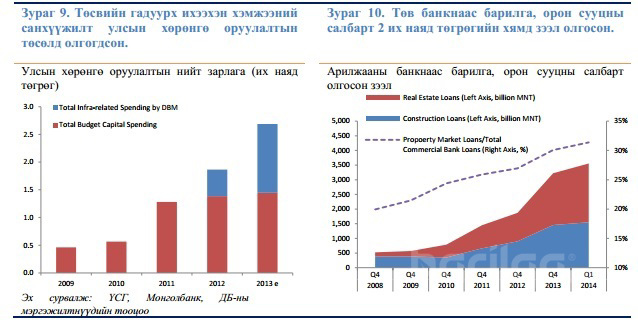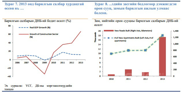 2013 оны эдийн засгийн хоёр оронтой өсөлтөнд бодлогын дэмжлэгтэйгээр өссөн барилгын салбар хувь нэмэр оруулсан ч орон сууцны салбарын хэт халалт бас санаа зовоож байна. Засгийн газар, төв банкнаас өнгөрсөн онд нийтдээ 3-4 их наяд төгрөг буюу ДНБ-ий 20 орчим хувьтай тэнцэх хөрөнгийг дэд бүтцийн барилга, байгууламж (ихэвчлэн зам), орон сууцанд олгосноор барилгын салбар 2013 онд 66.5 хувиар өссөн. Орон сууцны барилга мөн үед 50 хувиар өсч, төв банкны орон сууцны бага хүүтэй ипотекийн хөтөлбөрөөр нэмэгдсэн хэрэгцээг хангасан.