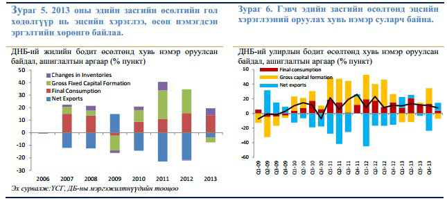 Засгийн газрын дэмжлэгтэй барилгын томоохон ажил өрнөж байгаа ч хувийн салбарын хөрөнгө оруулалт буурч байгаагаас эдийн засгийн өсөлтөнд хөрөнгө оруулалтын оруулах хувь нэмэр 2013 онд сөрөг тэмдэгтэй болж, энэ хандлага 2014 оны 1 дүгээр улиралд хэвээр хадгалагдаж байна. Эргэлтийн хөрөнгийн өөрчлөлтийн мэдээнээс харахад өнгөрсөн жилийн туршид борлуулагдаагүй бараа нэмж хуримтлагдсан байна. Эдийн засгийн төлөв, гадаад орчин суларч байгаа үед эргэлтийн хөрөнгийн үлдэгдэл ихээр нэмэгдсэн нь 2014 оны үйлдвэрлэлийн төлөвлөгөө хойшлогдож болзошгүйн дохио бөгөөд энэ нь эргээд эдийн засгийн өсөлтөнд сөргөөр нөлөөлж болох юм. Үүний зэрэгцээ зэсийн экспорт өсч байгаа болон импорт ихээхэн буурснаас цэвэр экспорт ихээхэн сайжирч эдийн засгийн өсөлтөнд гол хувь нэмэр оруулж байна (Зураг 6).