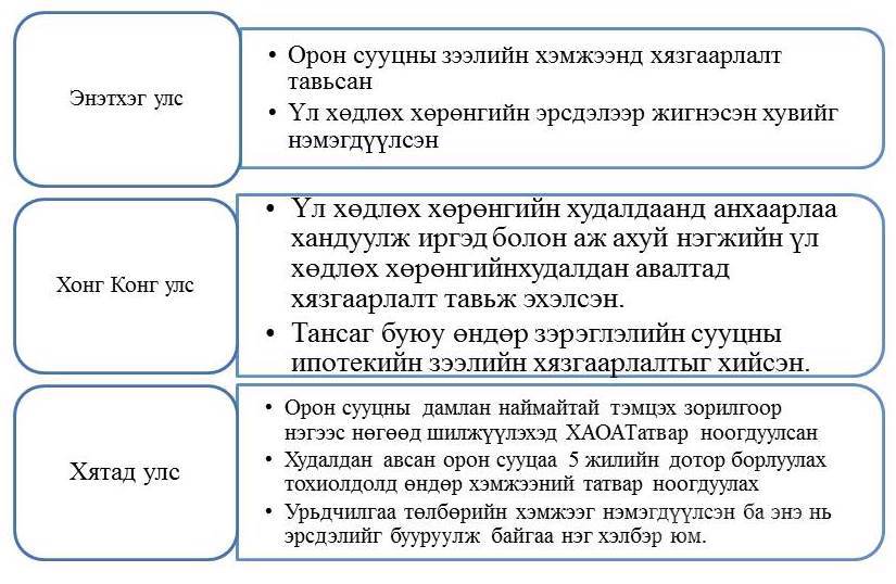 Харин гадны зарим улсад орон сууцны үнийг тогтворжуулах зорилгоор дараах арга хэмжээг авч хэрэгжүүлж байна.