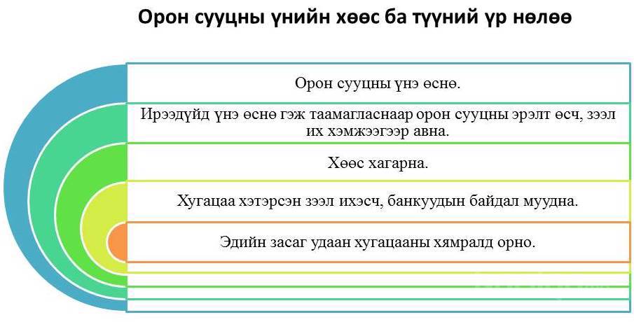 Өмнөх туршлагаас харахад орон сууцны үнийн хөөс нь санхүүгийн системд хямрал авчрах үндсэн шалтгаан болдог байна. Тиймээс төрийн зүгээс орон сууцны үнийг тогтворжуулах дорвитой арга хэмжээг авах шаардлагатай байна. Монголбанк, БХБЯ-ны хамтарсан “Барилгын салбарыг дэмжих, улмаар орон сууцны үнийг тогтворжуулах” дэд хөтөлбөрийг энэ оны эхэнд боловсруулан ажиллаж байгаа ч одоогийн энэ үнийн өсөлтийг сааруулж чадахгүй байна.