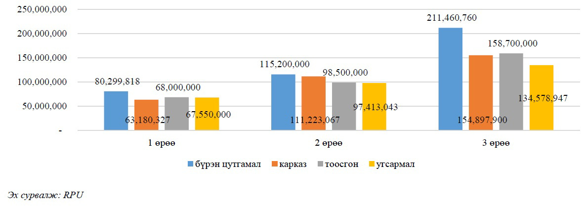 Дээрх хүснэгт болон өмнөх судалгааны дүнгээс харахад 2 өрөө байр борлуулалтанд хамгийн өндөр хувийг эзэлж байгаа бөгөөд БЗД, БГД-т хамгийн их, нь харагдана. Үүнээс хуучин орон сууцны үнийг жигнэсэн дунджаар болон түүвэрт хамрагдсан хамгийн дээд болон хамгийн доод үнээр авч үзвэл дараах байдалтай байна.