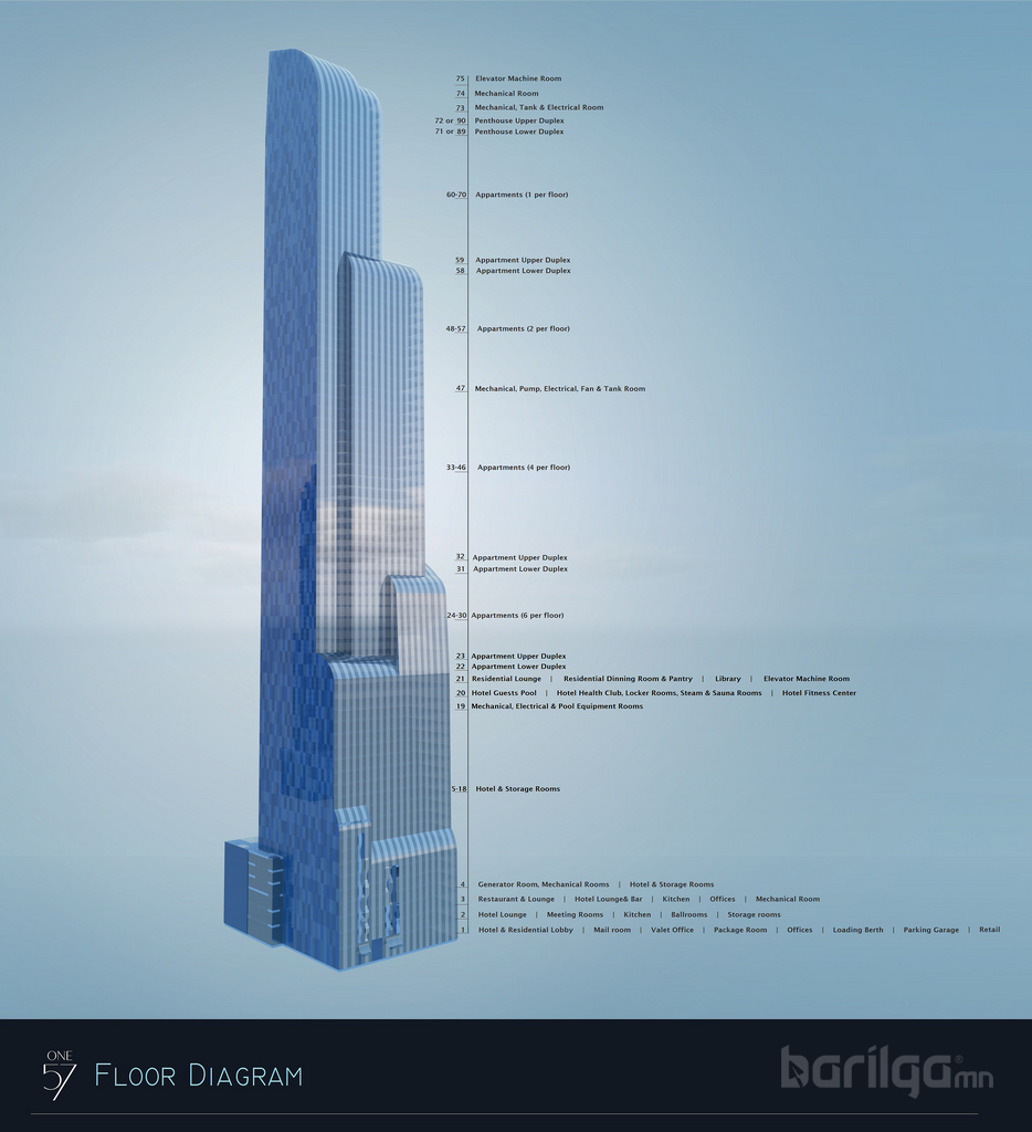 90 давхар, 306 метрийн өндөр барилга болох One57 Манхэттений 57-р гудамжинд Төв цэцэрлэгт хүрээлэнгийн ойролцоо байдаг байна.
