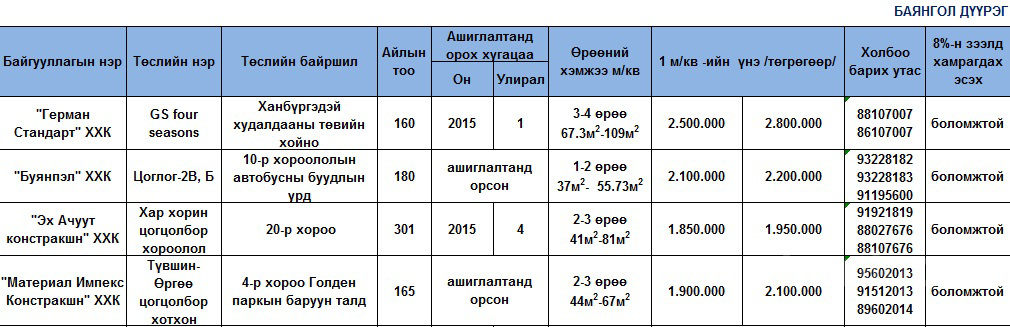 Иргэдийн амьдралд хамгийн ойр, үл хөдлөх хөрөнгийн зах зээл бол орон сууцны зах зээл юм. Энэхүү зах зээлийн чиг хандлага сүүлийн жилүүдэд тогтворгүй, үнийн өсөлт бууралт ажиглагдсан хэвээр байна. “Барилга.МН” сэтгүүл сар бүр шинэ орон сууцны үнэ ханшийн судалгааг хийдэг билээ. 2015 оны хоёрдугаар сарын байдлаар Улаанбаатар хотын Налайх, Сонгино-Хайрхан, Сүхбаатар, Баянгол, Баянзүрх, ХанУул, Чингэлтэй . Эдгээр орон сууцнуудын үнэ ханшийн дэлгэрэнгүй мэдээллийг “Барилга.МН” сэтгүүлийн 3-р сарын дугаараас хүлээн аваарай.