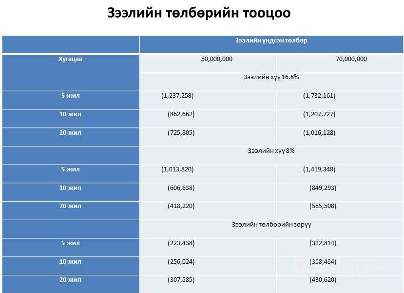 зээлийн дундаж хүү болох 16.8%, хөнгөлттэй зээл болох 8 % хүүтэй гэсэн хоёр нөхцөлөөр 5, 10, 20 жилийн хугацаатайгаар төлөх байдлаар тооцож харуулжээ. Хэрэв 50.0 сая төгрөгийг 5 жилийн хугацаатай авсан тохиолдолд сарын