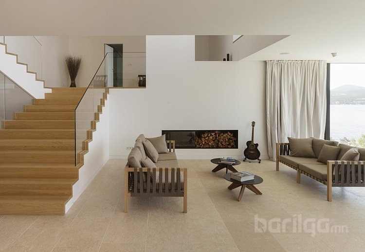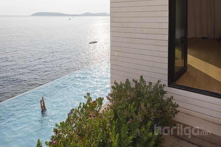 Тавцан дээрх шалнаас тааз хүрсэн том цонхноос харагдах харагдац болон архитектур далайгаас гадна бассейн хүртэл хийж өгсөнөөр гадна орчинг хэсэгчилэн дотор орон зайд авчирсан мэт санагдахаас гадна энэ нь хувийн шинж чанарыг бий болгох юм.