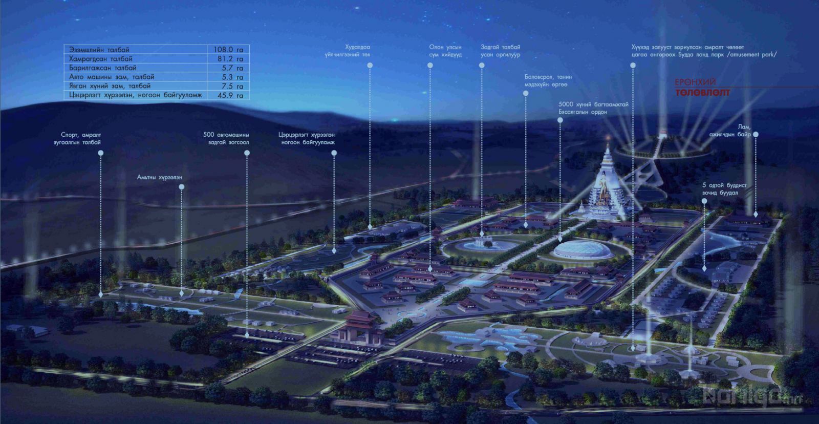Урьдчилсан төлөвлөлтөөр цогцолборын эргэн тойронд амралт зугаалгын цэцэрлэг хүрээлэн, ногоон байгууламж, жижиг амьтны хүрээлэн, задгай театр, усан парк зэрэг олон нийтийн хэсэг, бясалгалын төв, амирлахуйн орчин, боловсрол танин мэдэхүйн музей, одон орны төв, номын сан, урлахуйн сургууль зэрэг боловсролын хэсэг, Богдын өргөө, хутагт хувилгаадын өргөө, олон улс орны өвөрмөц онцлог уламжлалыг хадгалсан сүм хийд бүхий сүсэглэх, бишрэх хэсгийг төлөвлөснөөс гадна зочид буудал, гэр амралт хүний хэрэгцээг хангах орчин үеийн олон улсын стандартад нийцсэн худалдаа, хоолны үйлчилгээ, амралт чөлөөт цагаа өнгөөрөөх бүхий л бололцоог бүрдүүлсэн