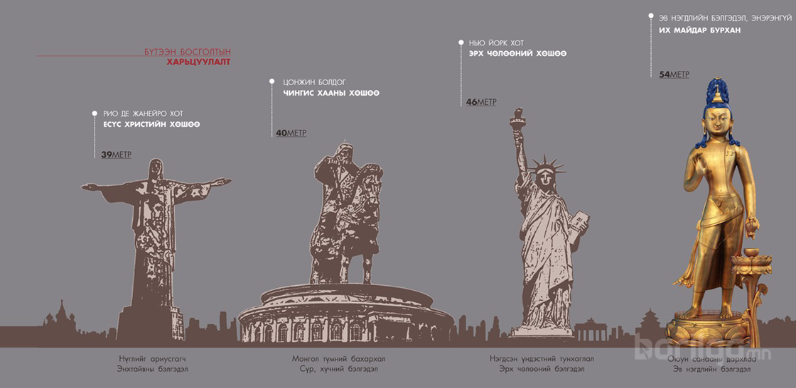 Өөрөөр хэлбэл бид эх түүх, үндэс гарлаараа бахархах бахархалаа эзэн Чингис хааны хөшөөгөө 40 метр өндрөөр Цонжин болдог хэмээх газар бүтээсэн. Гадны хэвлэл мэдээллийн хэрэгсэл, сурталчилгааны материал, интернетийн орчинд Монголын талаарх мэдээллийг хамгийн түрүүнд Чингисийн хөшөөтэй хамт илэрхийлсэн байдаг нь яах аргагүй Монголыг дэлхийд таниулсан залуу хойч үе минь хаана ч бахархах бахархалтай болж чадсан. Харин 2010 оноос бид бүхэн Анхдугаар Богд Занабазар Өндөр Гэгээний тэртээ 17 зууны эхэнд өөрийн гараар урлаж хойч үедээ соёлын үнэт өв болгон үлдээсэн Майдар бурханы босоо дүрийг 54 метр өндрөөр буюу дэлхийд томд тооцогдох хэмжээгээр бүтээх, мөн тойрон бүрэн хэмжээний соёл амралт, танин мэдэхүйн цогцолборыг бүтээн байгуулах ажлыг эхлүүлсэн.