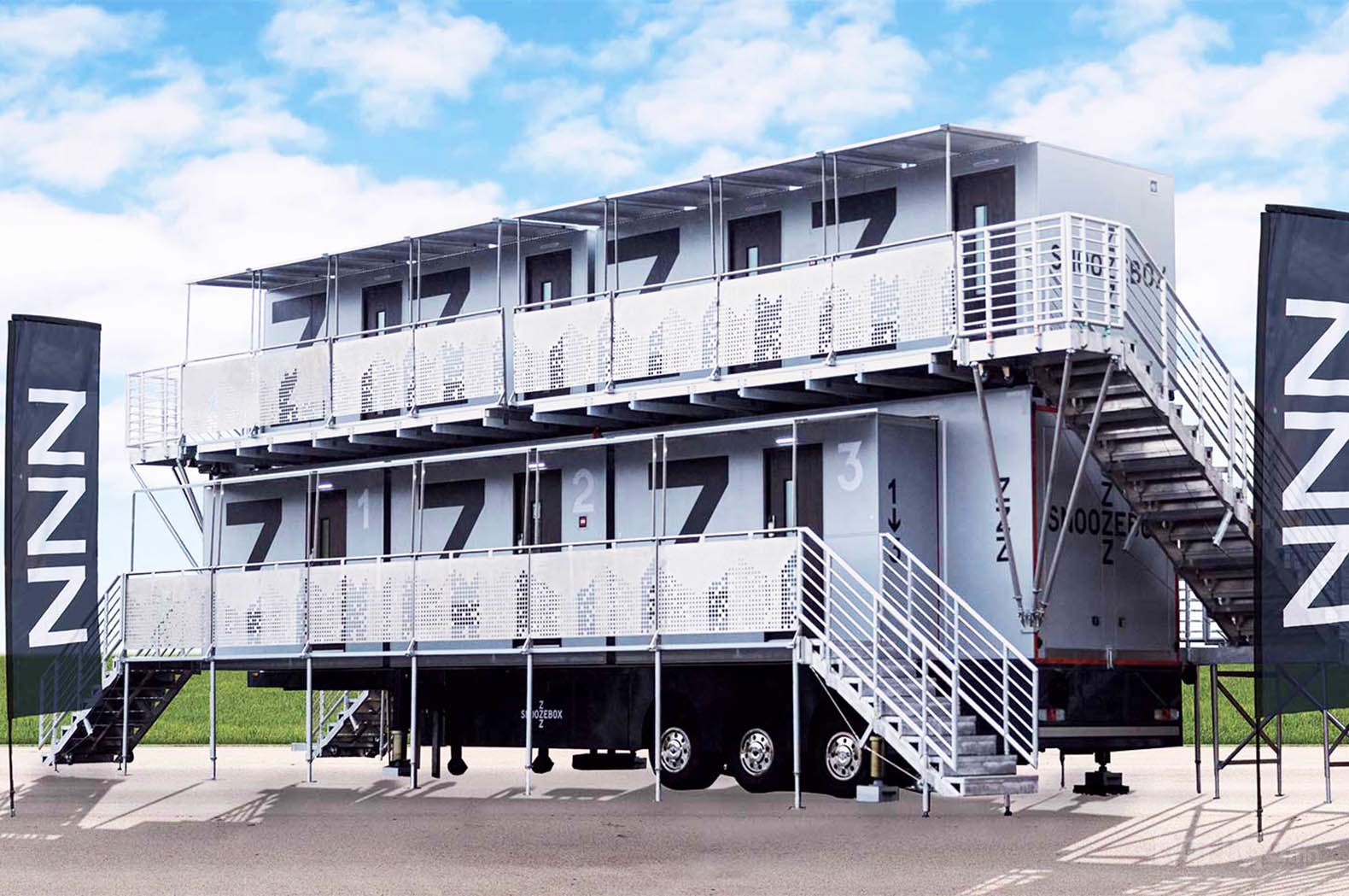 “Snoozebox” зочид буудлыг хаана ч зөөвөрлөж аваачих боломжтой тул дуу хөгжмийн наадам, богино хугацааны спортын арга хэмжээнд хэрэглэхэд тохиромжтой. Зочид буудлын дотоод заслыг гэртээ байгаа мэт тухтай амарч тухлах боломжтой байхаар төлөвлөж, бүхий л тавилга хэрэгслийг багтааж өгсөн. Буудлын дотор тухлаг буйдан, унтах үед эвхдэг ор болдог гоёмсог ширээ, угаалгын өрөө, хувцасны шүүгээ гээд бүгд бий. Өрөөний сонголтоо хийхдээ ганцаар, хосоороо, найз нөхөдтэйгээ явж байгаа зэргээс хамаарч 1-4 хүний багтаамжтайг сонгон орж болно. 100 өрөө бүхий зочид буудлын үйлчилгээг хоногийн 24 цагийн аль ч үед авах боломжтой.