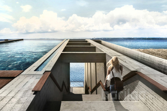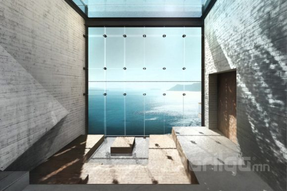Тус байшингийн гурван бетонон хана ерөнхийдөө амьдрах орон зайг тодорхойлох бөгөөд хадан дунд аж төрөх боломжийг олгох юм. Дээвэр дээр усан сан төлөвлөгдсөн байхаас гадна түүнтэй холбогдсон шилэн хана нарны гэрлийг нэвтрүүлж, далайн давлагааг тольдох цонх болох ажээ.