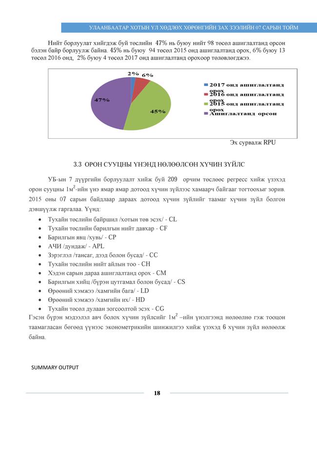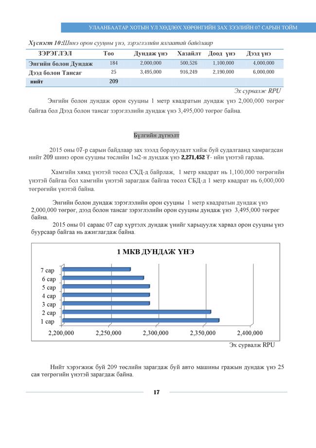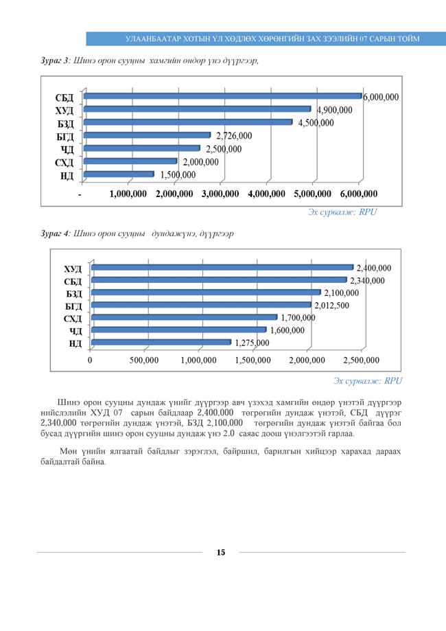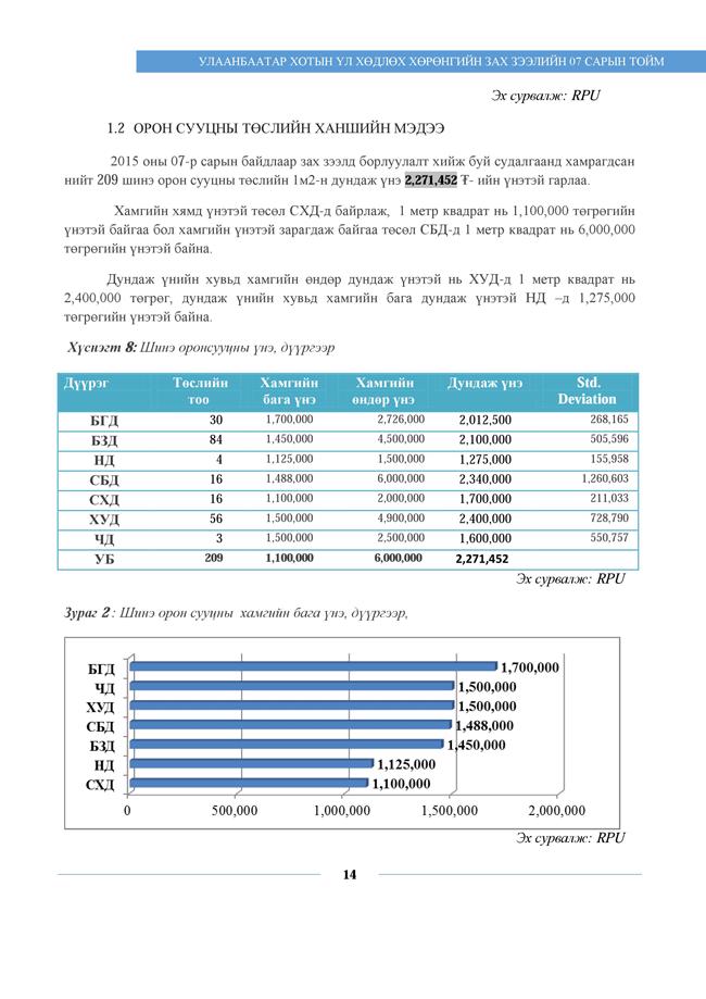 Орон сууцны зах зээлд борлуулалт хийж байгаа, судалгаанд хамруулсан 209 шинэ төслийн 1 ам метрийн дундаж үнэ 2015 оны 7-р сарын байдлаар 2,271,452 төгрөг байжээ. Үүнээс хамгийн хямд буюу 1 ам метр нь 1,100,000 төгрөгийн үнэтэй төсөл СХД-т байсан бол хамгийн өндөр буюу 1 ам метр нь 6,000,000 төгрөгийн үнэтэй төсөл СБД-т байрлаж байгааг судлаачид тогтоосон байна. Харин шинэ орон сууцны дундаж үнэ нь хамгийн өндөр байгаа ХУД-т ам метр нь 2,400,000, хамгийн хямд байгаа Налайх дүүрэгт 1,275,000 төгрөг байгаа аж.